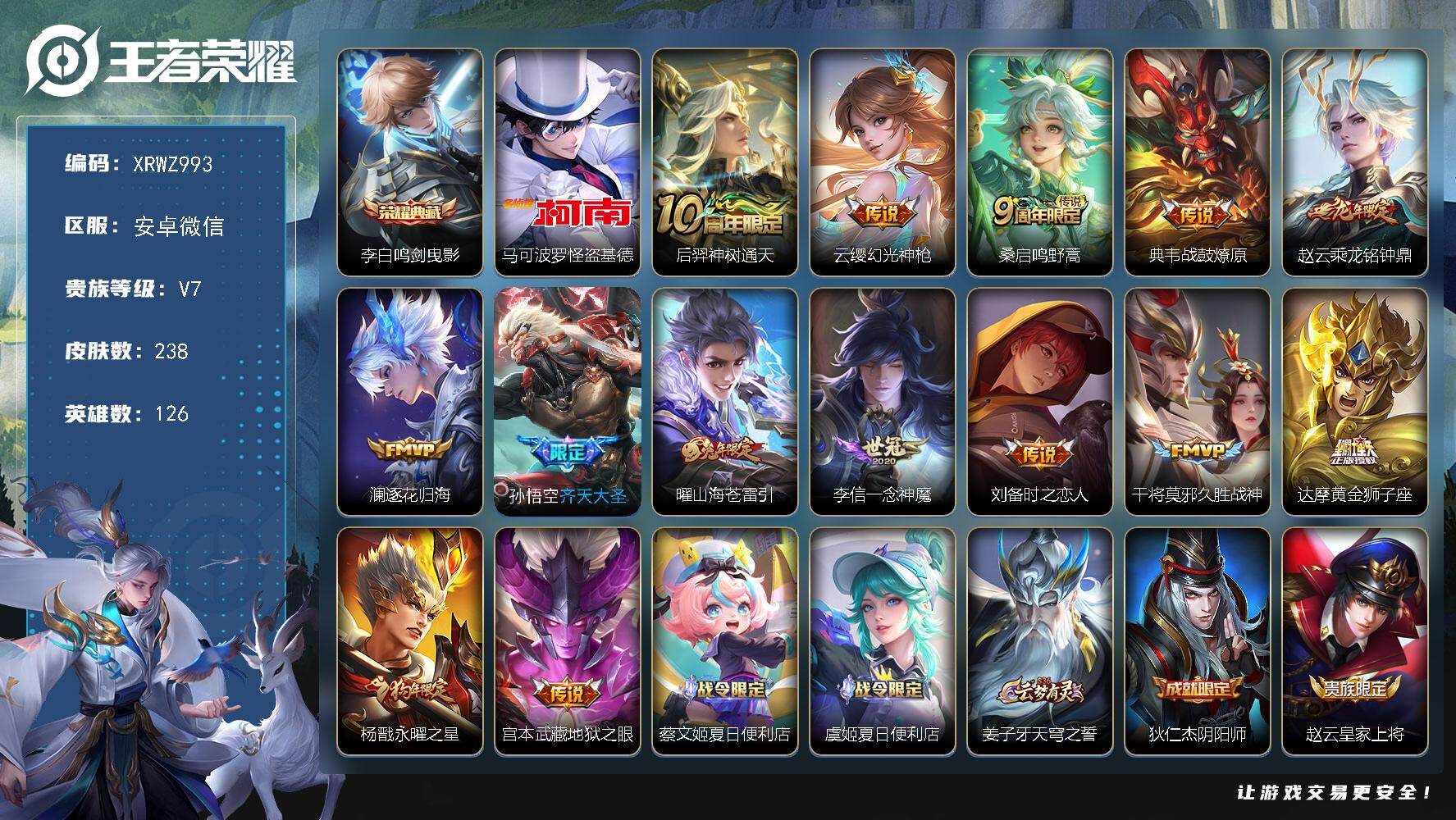 [15931478]Xr46836-安卓WX-无二次-V7-永恒钻石II段位-126英雄-238皮肤-1典藏皮肤-1珍品传说-14传说-65史诗【英雄全皮】:鬼谷子全皮,蒙恬全皮【荣耀典藏】:李白鸣剑曳影【珍品传说】:马可波罗怪盗基德【传说皮肤】:后羿神树通天,云缨幻光神枪,桑启鸣野蒿,典韦战鼓燎原,赵云乘龙铭钟鼎,澜逐花归海,孙悟空齐天大圣,曜山海苍雷引,李信一念神魔,刘备时之恋人,干将莫邪久胜战神,达摩黄金狮子座,杨戬永曜之星,宫本武藏地狱之眼【限定皮肤】:蔡文姬夏日便利店,虞姬夏日便利店,姜子牙天穹之誓,狄仁杰阴阳师,赵云皇家上将,墨子神迹守卫,墨子降魔,庄周高山流水,高渐离玩趣恶龙,芈月幻夜卜梦,元歌云间偶戏,元歌无心,夏侯惇朔风刀,狄仁杰魔术师,狄仁杰万华元夜,达摩沙漠行僧,项羽海滩派对,老夫子航海奇遇记,程咬金演武夺筹,兰陵王金庭之子,亚瑟潮玩骑士王,孙悟空齐天大圣,后羿辉光之辰,刘备百相守梦,李元芳云中旅人,钟馗驱傩正仪,杨戬永曜之星,干将莫邪胡桃夹子,雅典娜黎明之约,鬼谷子原初探秘者,鬼谷子五谷丰年,黄忠火炮绅士,苏烈千军破阵,百里玄策原初追逐者,弈星混沌棋,梦奇顽趣,沈梦溪星空之诺,沈梦溪大漠名商,裴擒虎李小龙,裴擒虎擒涛扼浪,米莱狄御霄,云中君纤云弄巧,盾山御銮,嫦娥暖冬兔眠,曜山海苍雷引,鲁班大师探海日志,桑启海盐诗旅,暃星界游侠,艾琳女武神,艾琳流音漫舞,司空震地狱燃心,张良古海寻踪,蒙犽百解令,蒙恬荣光圣徽,鬼谷子天穹祈灯,赵云乘龙铭钟鼎,百里玄策超元猎域,沈梦溪龙舞盛年,鲁班七号蔬乡物语,李元芳蔬乡物语,刘邦剑破天穹,程咬金群星魔术团,周瑜熔金海岸【年限皮肤】:杨戬永曜之星,后羿辉光之辰,曜山海苍雷引,赵云乘龙铭钟鼎【赛季限定】:夏侯惇朔风刀,狄仁杰万华元夜,达摩沙漠行僧,程咬金演武夺筹,兰陵王金庭之子,张良古海寻踪,李元芳云中旅人,钟馗驱傩正仪,雅典娜黎明之约,鬼谷子原初探秘者,苏烈千军破阵,百里玄策原初追逐者,弈星混沌棋,梦奇顽趣,沈梦溪大漠名商,裴擒虎擒涛扼浪,米莱狄御霄,盾山御銮,鲁班大师探海日志,桑启海盐诗旅,鬼谷子天穹祈灯,蒙恬荣光圣徽,刘邦剑破天穹,姜子牙天穹之誓【战令限定】:墨子神迹守卫,蔡文姬夏日便利店,虞姬夏日便利店,芈月幻夜卜梦,元歌云间偶戏,老夫子航海奇遇记,艾琳流音漫舞,亚瑟潮玩骑士王,黄忠火炮绅士,沈梦溪星空之诺王者荣耀 - 微信(安卓) -