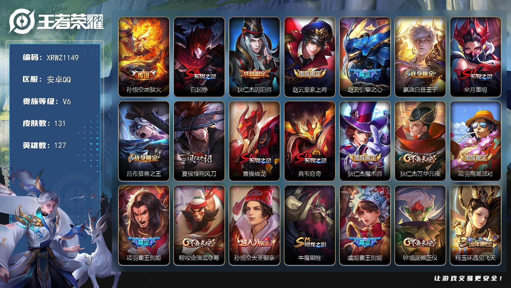 [16678634]XR47313-可二次-安卓-Q-V6-永恒钻石IV段位-127英雄-131皮肤-1传说-24史诗【传说皮肤】:孙悟空地狱火【限定皮肤】:白起狰,狄仁杰阴阳师,赵云皇家上将,赵云引擎之心,嬴政白昼王子,芈月重明,吕布猎兽之王,夏侯惇朔风刀,曹操烛龙,典韦穷奇,狄仁杰魔术师,狄仁杰万华元夜,项羽海滩派对,项羽霸王别姬,程咬金演武夺筹,孙悟空大圣娶亲,牛魔御旌,虞姬霸王别姬,钟馗驱傩正仪,杨玉环遇见飞天,太乙真人饕餮,鬼谷子原初探秘者,弈星混沌棋,沈梦溪大漠名商,明世隐疑决卦,裴擒虎擒涛扼浪,狂铁御狮,米莱狄御霄,云中君纤云弄巧,盾山御銮,鲁班大师探海日志,桑启海盐诗旅,鬼谷子天穹祈灯【赛季限定】:白起狰,太乙真人饕餮,曹操烛龙,芈月重明,典韦穷奇,狂铁御狮,米莱狄御霄,牛魔御旌,盾山御銮,夏侯惇朔风刀,弈星混沌棋,明世隐疑决卦,鬼谷子原初探秘者,狄仁杰万华元夜,程咬金演武夺筹,钟馗驱傩正仪,沈梦溪大漠名商,桑启海盐诗旅,裴擒虎擒涛扼浪,鲁班大师探海日志,鬼谷子天穹祈灯,太乙真人谧流熔炉,亚瑟荣光之誓【战令限定】:嬴政白昼王子,吕布猎兽之王,周瑜线条小狗【史诗皮肤】:赵云皇家上将,王昭君偶像歌手,狄仁杰魔术师,孙尚香水果甜心,妲己魅力维加斯,墨子金属风暴,曹操幽灵船长,李白千年之狐,张飞乱世虎臣,韩信白龙吟,项羽霸王别姬,虞姬霸王别姬,赵云引擎之心,兰陵王暗隐猎兽者,百里守约特工魅影,李元芳逐浪之夏,白起星夜王子,阿轲节奏热浪,杨玉环遇见飞天,嬴政白昼王子,孙悟空大圣娶亲,狄仁杰鹰眼统帅,橘右京修罗,云中君纤云弄巧,周瑜线条小狗【其他皮肤】:项羽海滩派对,韩信教廷特使,韩信街头霸王,露娜哥特玫瑰,阿轲爱心护理,达摩大发明家,赵云忍炎影,芈月红桃皇后,白起白色死神,武则天东方不败,扁鹊化身博士,安琪拉玩偶对对碰,孙膑天使之翼,妲己少女阿狸,典韦黄金武士,亚瑟死亡骑士,达摩拳王,花木兰兔女郎,张飞五福同心,甄姬花好人间,宫本武藏万象初新,后羿阿尔法小队,狄仁杰阴阳师,白起狰,钟无艳海滩丽影,太乙真人饕餮,宫本武藏霸王丸,曹操烛龙,王昭君幻想奇妙夜,芈月重明,狂铁命运角斗场,老夫子功夫老勺,典韦穷奇,李白敏锐之力,鬼谷子幻乐之宴,狂铁御狮,安琪拉如懿,米莱狄御霄,吕布猎兽之王,明世隐虹云星官,张良幽兰居士,牛魔御旌,吕布野性能量,盾山御銮,沈梦溪鲨炮海盗猫,姜子