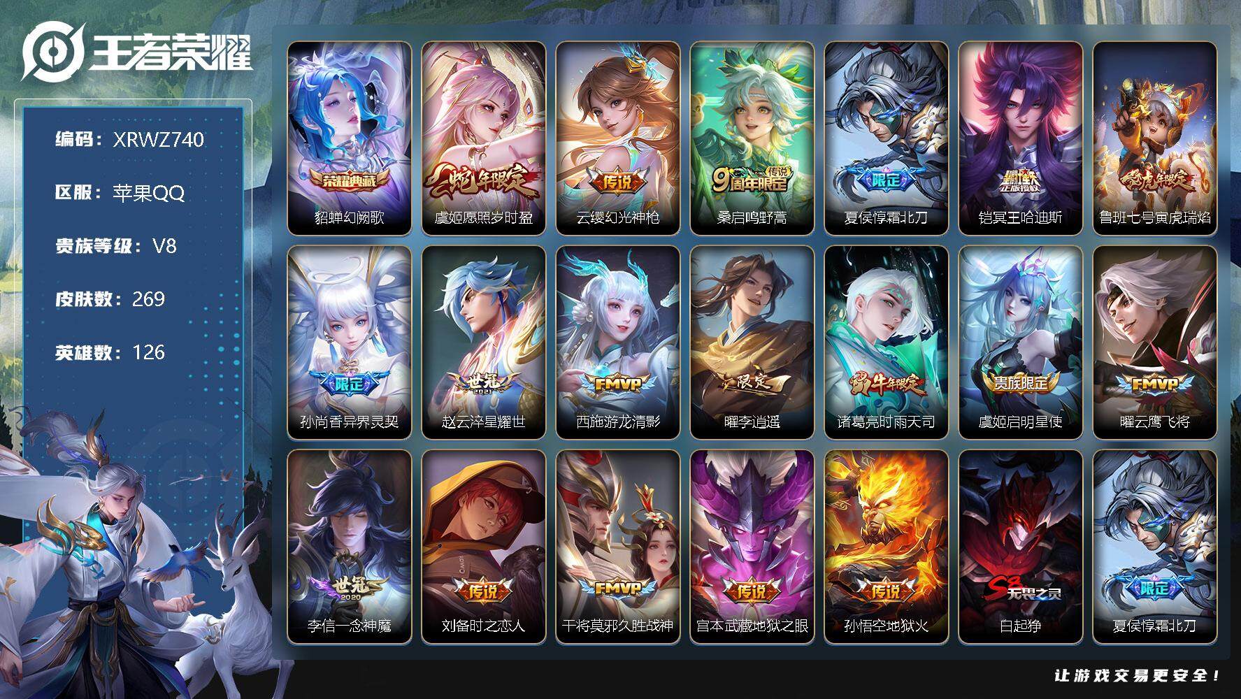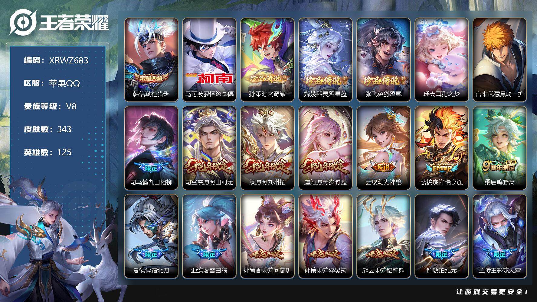 [12182795]xr41351-苹果Q-V8-最强王者段位-125英雄-343皮肤-1典藏-0珍品无双-0无双-6珍品传说-27传说-83史诗 【荣耀典藏】:韩信弑枪猎影 【珍品传说】:马可波罗怪盗基德,孙策时之奇旅,嫦娥器灵落星盏,张飞兔狲蓬尾,瑶大耳狗之梦,宫本武藏黑崎一护 【传说皮肤】:司马懿九山相柳,司空震愿照山河定,澜愿照九州拓,虞姬愿照岁时盈,云缨幻光神枪,裴擒虎祥瑞亨通,桑启鸣野蒿,夏侯惇霜北刀,亚连落雪白狼,孙尚香乘龙问璇玑,孙策乘龙淬吴钩,赵云乘龙铭钟鼎,铠琥珀纪元,兰陵王影龙天霄,吕布遇见神鼓,诸葛亮鹤羽星尊,孙悟空齐天大圣,李信山海炽霜斩,马超无双飞将,诸葛亮时雨天司,虞姬启明星使,刘备时之恋人,干将莫邪久胜战神,虞姬云霓雀翎,花木兰冠军飞将,后羿黄金射手座,狄仁杰超时空战士 【限定皮肤】:夏侯惇霜北刀,暃埋骨钱,蒙犽顽岩魄,蔡文姬夏日便利店,大乔绒语心约,虞姬夏日便利店,姜子牙天穹之誓,杨戬破阵退雄兵,李白谪仙醉月,狄仁杰阴阳师,赵云皇家上将,赵云引擎之心,赵云百木心枪,高渐离玩趣恶龙,阿轲迷踪丽影,吕布猎兽之王,吕布遇见神鼓,元歌无心,典韦蓝屏警告,马可波罗暗影游猎,狄仁杰魔术师,项羽海滩派对,关羽百相守梦,韩信傲雪梅枪,兰陵王影龙天霄,兰陵王驯魔猎人,孙悟空至尊宝,孙悟空孙行者,孙悟空齐天大圣,李元芳银河之约,李元芳云中旅人,虞姬启明星使,钟馗驱傩正仪,杨戬潮玩骑兵,哪吒逐梦之翼,雅典娜单词大作战,鬼谷子五谷丰年,诸葛亮时雨天司,诸葛亮鹤羽星尊,百里玄策原初追逐者,沈梦溪大漠名商,裴擒虎擒涛扼浪,狂铁电玩高手,云中君纤云弄巧,李信山海炽霜斩,嫦娥拒霜思,西施玲珑珍味,鲁班大师探海日志,桑启海盐诗旅,艾琳流音漫舞,赵怀真鹤归松栖,司空震地狱燃心,张良古海寻踪,蒙犽百解令,蒙恬荣光圣徽,高渐离燃音魔法,妲己灵卜魔法,鬼谷子天穹祈灯,伽罗琥珀纪元,铠琥珀纪元,姬小满妄想食味,大乔乘龙忆丹青,安琪拉乘龙聚宝船,孙尚香乘龙问璇玑,孙策乘龙淬吴钩,赵云乘龙铭钟鼎,百里玄策超元猎域,亚连落雪白狼,沈梦溪龙舞盛年,鲁班七号蔬乡物语,李元芳蔬乡物语,刘邦剑破天穹,程咬金群星魔术团,镜青焰无极,项羽苍威无极,刘备异域游侠,周瑜熔金海岸 【年限皮肤】:诸葛亮时雨天司,李信山海炽霜斩,大乔乘龙忆丹青,安琪拉乘龙聚宝船,孙尚香乘龙问璇玑,孙策乘龙淬吴钩,赵云乘龙铭钟鼎 【赛季限