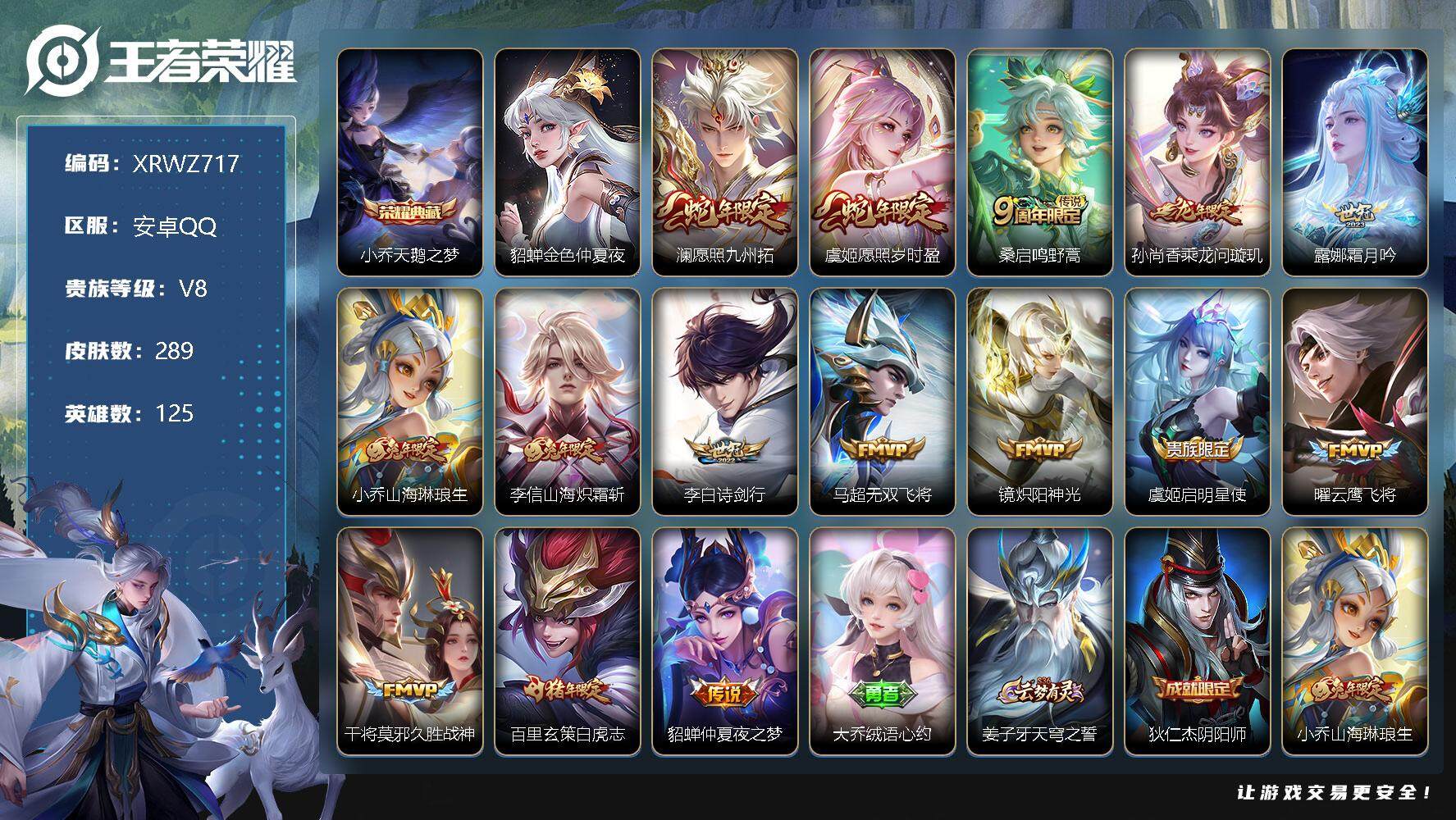 [12132037]Xr41348-安卓Q-V8-最强王者段位-125英雄-289皮肤-1典藏-1星元-15传说-81史诗 【荣耀典藏】:小乔天鹅之梦 【传说皮肤】:澜愿照九州拓,虞姬愿照岁时盈,桑启鸣野蒿,孙尚香乘龙问璇玑,露娜霜月吟,小乔山海琳琅生,李信山海炽霜斩,李白诗剑行,马超无双飞将,镜炽阳神光,虞姬启明星使,曜云鹰飞将,干将莫邪久胜战神,百里玄策白虎志,貂蝉仲夏夜之梦 【限定皮肤】:大乔绒语心约,姜子牙天穹之誓,狄仁杰阴阳师,小乔山海琳琅生,赵云皇家上将,孙尚香蔷薇恋人,庄周高山流水,扁鹊奇幻香踪,元歌无心,马可波罗山海玄木吟,狄仁杰魔术师,狄仁杰万华元夜,达摩沙漠行僧,项羽海滩派对,老夫子醍醐杖,貂蝉逐梦之音,程咬金演武夺筹,兰陵王金庭之子,孙悟空至尊宝,孙悟空孙行者,李元芳银河之约,李元芳云中旅人,虞姬启明星使,钟馗驱傩正仪,杨戬潮玩骑兵,干将莫邪胡桃夹子,蔡文姬繁星吟游,鬼谷子原初探秘者,鬼谷子五谷丰年,苏烈千军破阵,百里玄策白虎志,梦奇顽趣,公孙离蜜橘之夏,沈梦溪大漠名商,裴擒虎李小龙,裴擒虎擒涛扼浪,瑶山海碧波行,云中君纤云弄巧,李信山海炽霜斩,上官婉儿梁祝,嫦娥拒霜思,嫦娥暖冬兔眠,西施玲珑珍味,鲁班大师探海日志,桑启海盐诗旅,暃星界游侠,艾琳女武神,艾琳流音漫舞,司空震地狱燃心,阿古朵江河有灵,张良古海寻踪,蒙犽百解令,蒙恬荣光圣徽,高渐离燃音魔法,妲己灵卜魔法,鬼谷子天穹祈灯,伽罗琥珀纪元,大乔乘龙忆丹青,安琪拉乘龙聚宝船,孙尚香乘龙问璇玑,沈梦溪龙舞盛年,鲁班七号蔬乡物语,李元芳蔬乡物语,刘邦剑破天穹,上官婉儿群星魔术团,镜青焰无极,项羽苍威无极,刘备异域游侠,周瑜熔金海岸 【年限皮肤】:百里玄策白虎志,马超神威,瑶山海碧波行,马可波罗山海玄木吟,李信山海炽霜斩,小乔山海琳琅生,大乔乘龙忆丹青,安琪拉乘龙聚宝船,孙尚香乘龙问璇玑 【赛季限定】:狄仁杰万华元夜,达摩沙漠行僧,老夫子醍醐杖,程咬金演武夺筹,兰陵王金庭之子,张良古海寻踪,李元芳云中旅人,钟馗驱傩正仪,鬼谷子原初探秘者,苏烈千军破阵,梦奇顽趣,沈梦溪大漠名商,裴擒虎擒涛扼浪,鲁班大师探海日志,桑启海盐诗旅,鬼谷子天穹祈灯,蒙恬荣光圣徽,刘邦剑破天穹,姜子牙天穹之誓 【战令限定】:扁鹊奇幻香踪,艾琳流音漫舞,李元芳银河之约,杨戬潮玩骑兵,嫦娥暖冬兔眠,西施玲珑珍味,司空震地狱燃心,暃星界游侠,高渐王者荣耀 - QQ(安卓) -
