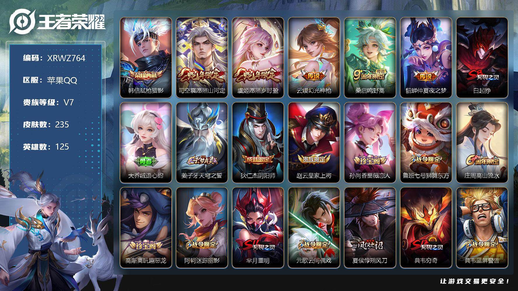 [12499697]Xr42729-苹果Q-V7-永恒钻石V段位-125英雄-235皮肤-1典藏-0珍品无双-0无双-0珍品传说-5传说-58史诗【英雄全皮】:空空儿全皮【荣耀典藏】:韩信弑枪猎影【传说皮肤】:司空震愿照山河定,虞姬愿照岁时盈,云缨幻光神枪,桑启鸣野蒿,貂蝉仲夏夜之梦【限定皮肤】:白起狰,大乔绒语心约,姜子牙天穹之誓,狄仁杰阴阳师,赵云皇家上将,孙尚香蔷薇恋人,鲁班七号狮舞东方,庄周高山流水,高渐离玩趣恶龙,阿轲迷踪丽影,芈月重明,元歌云间偶戏,夏侯惇朔风刀,典韦穷奇,典韦蓝屏警告,马可波罗暗影游猎,狄仁杰魔术师,狄仁杰万华元夜,项羽海滩派对,老夫子醍醐杖,程咬金演武夺筹,刘邦夺宝奇兵,韩信飞衡,兰陵王金庭之子,亚瑟潮玩骑士王,孙悟空至尊宝,牛魔御旌,后羿圣弓游侠,李元芳银河之约,李元芳云中旅人,钟馗神迹守卫,钟馗驱傩正仪,杨玉环遇见飞天,女娲朔望之晖,雅典娜单词大作战,蔡文姬繁星吟游,鬼谷子原初探秘者,苏烈千军破阵,百里玄策原初追逐者,弈星混沌棋,沈梦溪星空之诺,沈梦溪大漠名商,明世隐疑决卦,裴擒虎李小龙,裴擒虎擒涛扼浪,狂铁御狮,米莱狄御霄,云中君纤云弄巧,盾山御銮,猪八戒西部大镖客,蒙犽狂想玩偶喵,鲁班大师探海日志,桑启海盐诗旅,张良古海寻踪,鬼谷子天穹祈灯,沈梦溪龙舞盛年,鲁班七号蔬乡物语,李元芳蔬乡物语,刘邦剑破天穹,上官婉儿群星魔术团,程咬金群星魔术团,镜青焰无极,项羽苍威无极,周瑜熔金海岸【年限皮肤】:韩信飞衡【赛季限定】:白起狰,芈月重明,夏侯惇朔风刀,典韦穷奇,狄仁杰万华元夜,老夫子醍醐杖,程咬金演武夺筹,兰陵王金庭之子,张良古海寻踪,牛魔御旌,李元芳云中旅人,钟馗驱傩正仪,鬼谷子原初探秘者,苏烈千军破阵,百里玄策原初追逐者,弈星混沌棋,沈梦溪大漠名商,明世隐疑决卦,裴擒虎擒涛扼浪,狂铁御狮,米莱狄御霄,盾山御銮,鲁班大师探海日志,桑启海盐诗旅,鬼谷子天穹祈灯,刘邦剑破天穹,姜子牙天穹之誓【战令限定】:鲁班七号狮舞东方,阿轲迷踪丽影,元歌云间偶戏,典韦蓝屏警告,马可波罗暗影游猎,刘邦夺宝奇兵,亚瑟潮玩骑士王,后羿圣弓游侠,李元芳银河之约,钟馗神迹守卫,女娲朔望之晖,雅典娜单词大作战,沈梦溪星空之诺,猪八戒西部大镖客,蒙犽狂想玩偶喵,鲁班七号蔬乡物语,李元芳蔬乡物语,镜青焰无极,项羽苍威无极【史诗皮肤】:鲁班七号电玩小子,露娜紫霞仙子,王者荣耀 - QQ(苹果) -