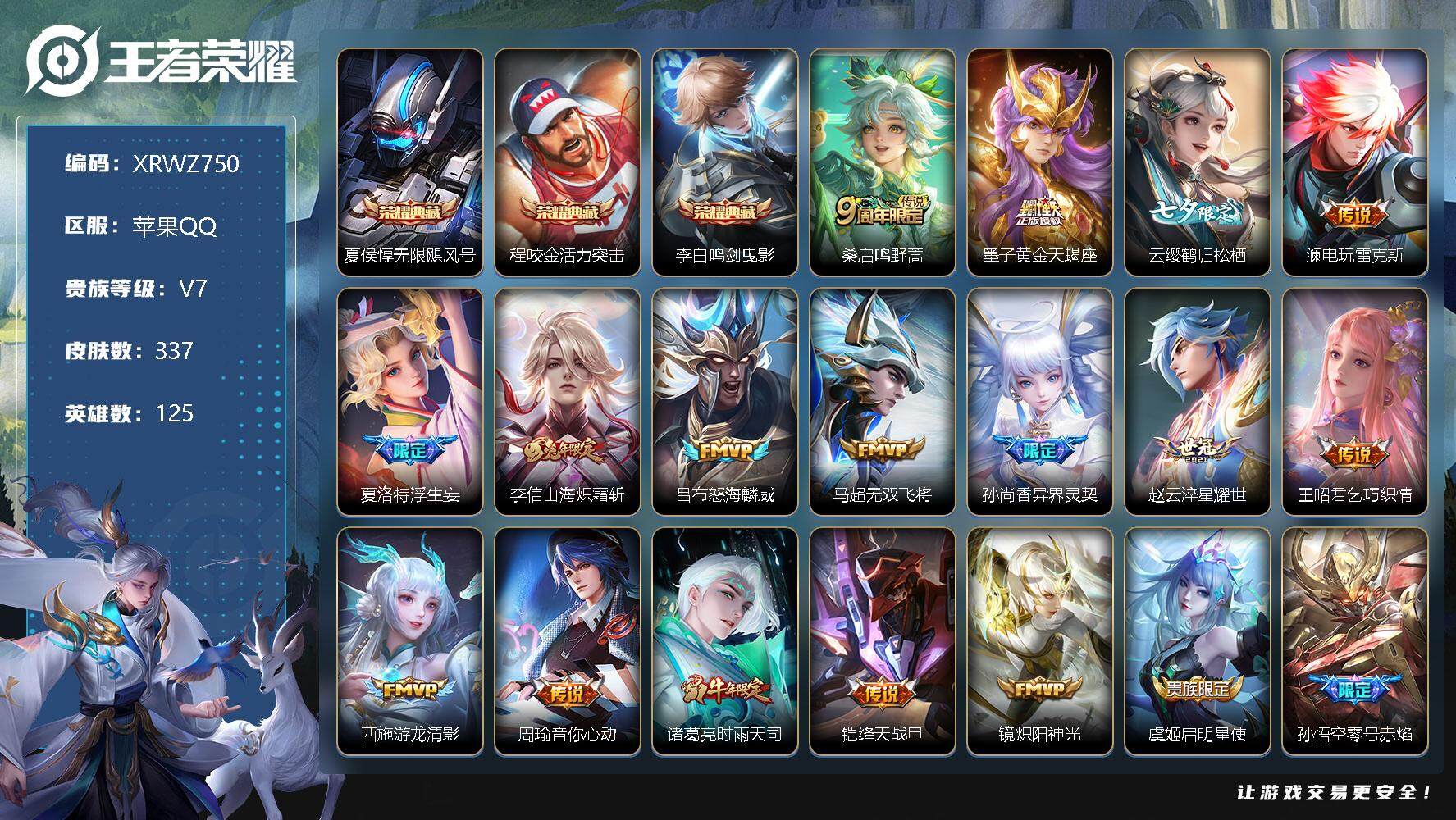 [12502675]XR42603-苹果Q-V7-至尊星耀II段位-125英雄-337皮肤-3典藏-29传说-117史诗【英雄全皮】:狂铁全皮,李信全皮,猪八戒全皮,夏洛特全皮【荣耀典藏】:夏侯惇无限飓风号,程咬金活力突击,李白鸣剑曳影【传说皮肤】:桑启鸣野蒿,墨子黄金天蝎座,云缨鹤归松栖,澜电玩雷克斯,夏洛特浮生妄,李信山海炽霜斩,吕布怒海麟威,马超无双飞将,孙尚香异界灵契,赵云淬星耀世,王昭君乞巧织情,西施游龙清影,周瑜音你心动,诸葛亮时雨天司,铠绛天战甲,镜炽阳神光,虞姬启明星使,孙悟空零号赤焰,曜云鹰飞将,李信一念神魔,伽罗太华,张良黄金白羊座,干将莫邪久胜战神,花木兰冠军飞将,梦奇胖达荣荣,后羿黄金射手座,貂蝉仲夏夜之梦,宫本武藏地狱之眼,狄仁杰超时空战士【限定皮肤】:白起狰,姜子牙天穹之誓,杨戬破阵退雄兵,狄仁杰阴阳师,虞姬凯尔特女王,廉颇寅虎御盾,赵云皇家上将,赵云百木心枪,墨子神迹守卫,嬴政优雅恋人,孙尚香异界灵契,庄周蜃楼王,庄周高山流水,高渐离死亡摇滚,阿轲迷踪丽影,孙膑妖精王,扁鹊炼金王,白起夜都怪侠,芈月重明,芈月白晶晶,芈月幻夜卜梦,元歌云间偶戏,夏侯惇朔风刀,甄姬女儿国国王,甄姬游园惊梦,曹操烛龙,典韦穷奇,典韦岱宗,马可波罗逐梦之星,马可波罗暗影游猎,狄仁杰魔术师,狄仁杰万华元夜,达摩星际陆战队,达摩沙漠行僧,项羽海滩派对,老夫子醍醐杖,老夫子航海奇遇记,关羽冰锋战神,程咬金演武夺筹,露娜一生所爱,刘邦夺宝奇兵,韩信傲雪梅枪,兰陵王金庭之子,花木兰青春决赛季,亚瑟潮玩骑士王,孙悟空大圣娶亲,孙悟空零号赤焰,牛魔御旌,后羿圣弓游侠,刘备百相守梦,李元芳云中旅人,虞姬启明星使,钟馗驱傩正仪,杨玉环遇见飞天,杨戬潮玩骑兵,干将莫邪冰霜恋舞曲,干将莫邪真爱魔法,雅典娜单词大作战,雅典娜黎明之约,蔡文姬繁星吟游,太乙真人饕餮,鬼谷子原初探秘者,鬼谷子五谷丰年,诸葛亮时雨天司,黄忠火炮绅士,苏烈玄武志,苏烈千军破阵,百里玄策原初追逐者,百里守约朱雀志,弈星混沌棋,沈梦溪大漠名商,明世隐疑决卦,裴擒虎李小龙,裴擒虎擒涛扼浪,狂铁御狮,狂铁电玩高手,米莱狄御霄,米莱狄胡桃异想国,云中君纤云弄巧,李信山海炽霜斩,伽罗太华,伽罗天狼溯光者,盾山御銮,猪八戒西部大镖客,猪八戒猪悟能,上官婉儿梁祝,上官婉儿天狼绘梦者,嫦娥拒霜思,西施玲珑珍味,蒙犽狂想玩偶喵,鲁班大师探