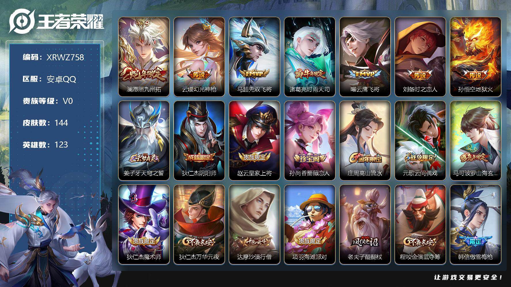 [12132132]Xr41477-安卓Q-V11-最强王者段位-126英雄-524皮肤-10典藏-4无双-4珍品传说-4星元-73传说-158史诗【荣耀典藏】:武则天英雄,孙悟空全息碎影,武则天倪克斯神谕,小乔天鹅之梦,鲁班七号星空梦想,李白鸣剑曳影,诸葛亮星域神启,貂蝉幻阙歌,韩信弑枪猎影,虞姬神鉴启示录,伽罗最初的交响【无双皮肤】:李白碎月剑心,韩信群星魔术团,曜器灵螭龙剑,诸葛亮天机白泽【珍品传说】:马可波罗怪盗基德,鲁班七号江户川柯南,嫦娥器灵落星盏,宫本武藏黑崎一护【传说皮肤】:干将莫邪千山共赴,元歌诡秘之主,大司命死亡执政官,司马懿九山相柳,后羿千劫归真,司空震愿照山河定,女娲愿照千秋盛,妲己愿照众生和,澜愿照九州拓,蔡文姬愿照福禄聚,虞姬愿照岁时盈,云缨幻光神枪,裴擒虎祥瑞亨通,桑启鸣野蒿,夏侯惇霜北刀,铠冥王哈迪斯,朵莉亚心动手记,墨子黄金天蝎座,典韦战鼓燎原,孙尚香乘龙问璇玑,孙策乘龙淬吴钩,赵云乘龙铭钟鼎,澜逐花归海,艾琳觅芳踪,露娜霜月吟,宫本武藏惊梅引,东皇太一灼幽烈阳,诸葛亮鹤羽星尊,公孙离记忆之芯,孙悟空齐天大圣,李信山海炽霜斩,吕布怒海麟威,李白诗剑行,狄仁杰神器狴犴令,百里守约碎云,马超无双飞将,蔡文姬花朝如约,女娲补天,孙策末日机甲,孙尚香异界灵契,貂蝉遇见胡旋,赵云淬星耀世,王昭君乞巧织情,西施游龙清影,李元芳飞鸢探春,公孙离祈雪灵祝,诸葛亮时雨天司,铠绛天战甲,镜炽阳神光,虞姬启明星使,关羽武圣,曜云鹰飞将,李信一念神魔,刘备时之恋人,伽罗太华,貂蝉猫影幻舞,张良黄金白羊座,干将莫邪久胜战神,虞姬云霓雀翎,达摩黄金狮子座,百里玄策白虎志,花木兰冠军飞将,梦奇胖达荣荣,后羿黄金射手座,诸葛亮武陵仙君,貂蝉仲夏夜之梦,李白凤求凰,孙尚香末日机甲,宫本武藏地狱之眼,孙悟空地狱火,吕布天魔缭乱,武则天海洋之心,狄仁杰超时空战士【限定皮肤】:白起狰,夏侯惇霜北刀,铠冥王哈迪斯,暃埋骨钱,蒙犽顽岩魄,蔡文姬夏日便利店,大乔绒语心约,虞姬夏日便利店,姜子牙天穹之誓,李白谪仙醉月,狄仁杰阴阳师,虞姬凯尔特女王,廉颇寅虎御盾,赵云皇家上将,赵云引擎之心,赵云龙胆,赵云百木心枪,墨子神迹守卫,嬴政优雅恋人,嬴政白昼王子,孙尚香异界灵契,鲁班七号狮舞东方,鲁班七号乒乒小将,庄周高山流水,高渐离死亡摇滚,高渐离玩趣恶龙,扁鹊奇幻香踪,白起夜都怪侠,芈月重明,