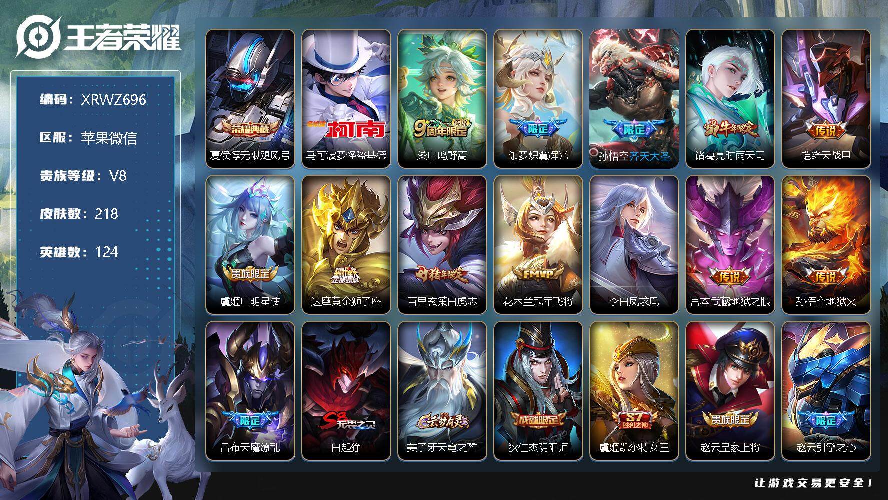 [12528391]Xr41757-苹果WX-V8-最强王者段位-124英雄-218皮肤-1典藏-1珍品传说-13传说-62史诗-不可二次【荣耀典藏】:夏侯惇无限飓风号【珍品传说】:马可波罗怪盗基德【传说皮肤】:桑启鸣野蒿,伽罗炽翼辉光,孙悟空齐天大圣,诸葛亮时雨天司,铠绛天战甲,虞姬启明星使,达摩黄金狮子座,百里玄策白虎志,花木兰冠军飞将,李白凤求凰,宫本武藏地狱之眼,孙悟空地狱火,吕布天魔缭乱【限定皮肤】:白起狰,姜子牙天穹之誓,狄仁杰阴阳师,虞姬凯尔特女王,赵云皇家上将,赵云引擎之心,嬴政优雅恋人,嬴政白昼王子,庄周高山流水,高渐离死亡摇滚,高渐离玩趣恶龙,芈月重明,芈月白晶晶,吕布天魔缭乱,吕布猎兽之王,元歌云间偶戏,夏侯惇朔风刀,甄姬游园惊梦,曹操烛龙,典韦穷奇,马可波罗暗影游猎,狄仁杰魔术师,狄仁杰万华元夜,达摩星际陆战队,达摩沙漠行僧,项羽海滩派对,老夫子醍醐杖,关羽冰锋战神,程咬金演武夺筹,兰陵王金庭之子,亚瑟潮玩骑士王,孙悟空孙行者,孙悟空齐天大圣,牛魔御旌,后羿辉光之辰,李元芳云中旅人,虞姬启明星使,钟馗驱傩正仪,杨玉环遇见飞天,雅典娜黎明之约,太乙真人饕餮,鬼谷子原初探秘者,鬼谷子五谷丰年,诸葛亮时雨天司,铠青龙志,苏烈千军破阵,百里玄策白虎志,百里玄策原初追逐者,弈星混沌棋,梦奇顽趣,公孙离蜜橘之夏,沈梦溪大漠名商,明世隐疑决卦,裴擒虎李小龙,裴擒虎擒涛扼浪,狂铁御狮,米莱狄御霄,米莱狄胡桃异想国,云中君纤云弄巧,伽罗炽翼辉光,盾山御銮,猪八戒西部大镖客,猪八戒猪悟能,上官婉儿梁祝,鲁班大师探海日志,桑启海盐诗旅,张良古海寻踪,蒙犽百解令,蒙恬荣光圣徽,鬼谷子天穹祈灯,刘邦剑破天穹,程咬金群星魔术团【年限皮肤】:百里玄策白虎志,铠青龙志,李白凤求凰,后羿辉光之辰,诸葛亮时雨天司,伽罗炽翼辉光【赛季限定】:白起狰,芈月重明,夏侯惇朔风刀,曹操烛龙,典韦穷奇,狄仁杰万华元夜,达摩沙漠行僧,老夫子醍醐杖,程咬金演武夺筹,兰陵王金庭之子,张良古海寻踪,牛魔御旌,李元芳云中旅人,虞姬凯尔特女王,钟馗驱傩正仪,雅典娜黎明之约,太乙真人饕餮,鬼谷子原初探秘者,苏烈千军破阵,百里玄策原初追逐者,弈星混沌棋,梦奇顽趣,沈梦溪大漠名商,明世隐疑决卦,裴擒虎擒涛扼浪,狂铁御狮,米莱狄御霄,盾山御銮,鲁班大师探海日志,桑启海盐诗旅,鬼谷子天穹祈灯,蒙恬荣光圣徽,刘邦剑破天