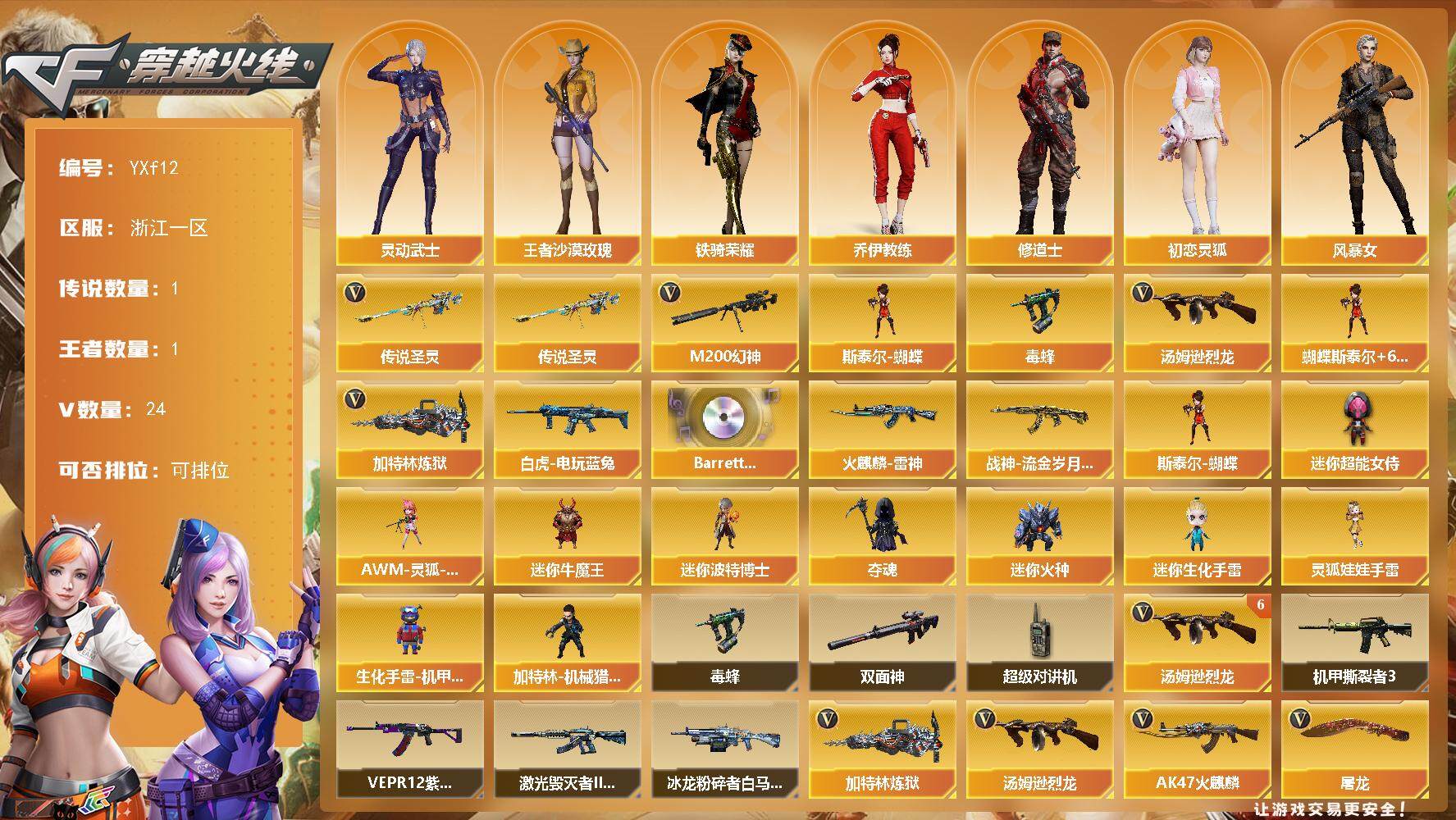 【东部精品生化号.幻神.传说圣灵.斯太尔蝴蝶.6烈龙.电玩蓝兔.生化四防王者沙漠玫瑰】YXf12【无二次】【因赛季更新游戏段付以上号为准!】 浙江一区-24V-1王者-0炫金 【传说武器】:传说圣灵 【热门武器】:传说圣灵,M200-幻神,白虎-电玩蓝兔,毒蜂,汤姆逊-烈龙*6,加特林-炼狱,斯泰尔-蝴蝶 【音效卡】:Barrett-碧霄极光音效卡 【皮肤】:火麒麟-雷神,战神-流金岁月皮肤 【角色】:王者沙漠玫瑰,乔伊教练,修道士,初恋灵狐,风暴女,嘉年华灵狐,娟娟,灵动武士,灵狐者-七夕宝贝,龙儿-小淘气,斯沃特-X,铁骑荣耀,雪莉杨-摸金校尉 【人偶武器】:斯泰尔-蝴蝶,加特林-机械猎穿越火线 - 东部战区 - 浙江