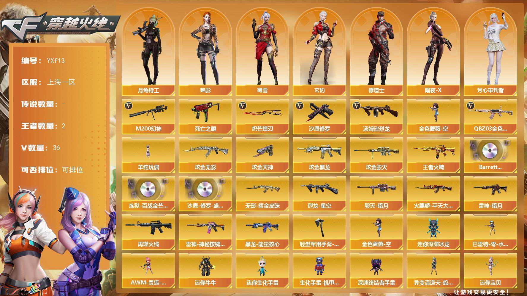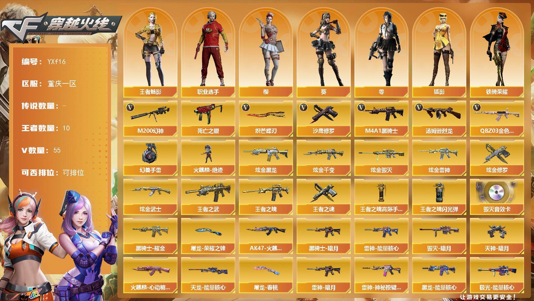 XH2296/西部/重庆一起/可排位/【荣耀之巅214豆】【Lv102荣耀元帅】VIP6/62V/2王者/4炫金/传说辉光/传说破晓/【幻神三件套】【幻神6皮】/幻神/幻神音效卡/幻神星火小队签名臻藏版/幻神宠儿/幻神N9/幻神青鹤/幻神冠军之幻/幻神黄忠/M200竞技荣光套/王者星神/王者风神/QBZ金色蔷薇/*2/QBZ冠军之薇/王者白虎/金色蔷薇古蛇迷踪/玄武/白虎/白虎大汉风骨/朱雀/朱雀武当/神工天巧M4/柯尔特冠军之特/COP雷霆/冠军之刃/语音特效机器人/【音效卡】/黑骑士音效卡/毁灭音效卡/【枪皮】/星神巅峰荣耀/火麒麟白虎/雷神宇航兔/黑龙冠军之武/雷神宠儿/雷神传奇N9/黑骑士冠军之势/M4战神赵云/雷神冠军之魄/毁灭冠军之怒/【四防】/王者魅影/隼/【角色】/零/蛇隐宗/审判者/王者涂鸦/【小人枪】/朱雀蛇隐宗/斯太尔蝴蝶/【道具】/永久烟雾头/护目镜/各种戒指/永久AC/永久雷包/细节看图/【账号未封过十年】/穿越火线 - 西部战区 - 重庆