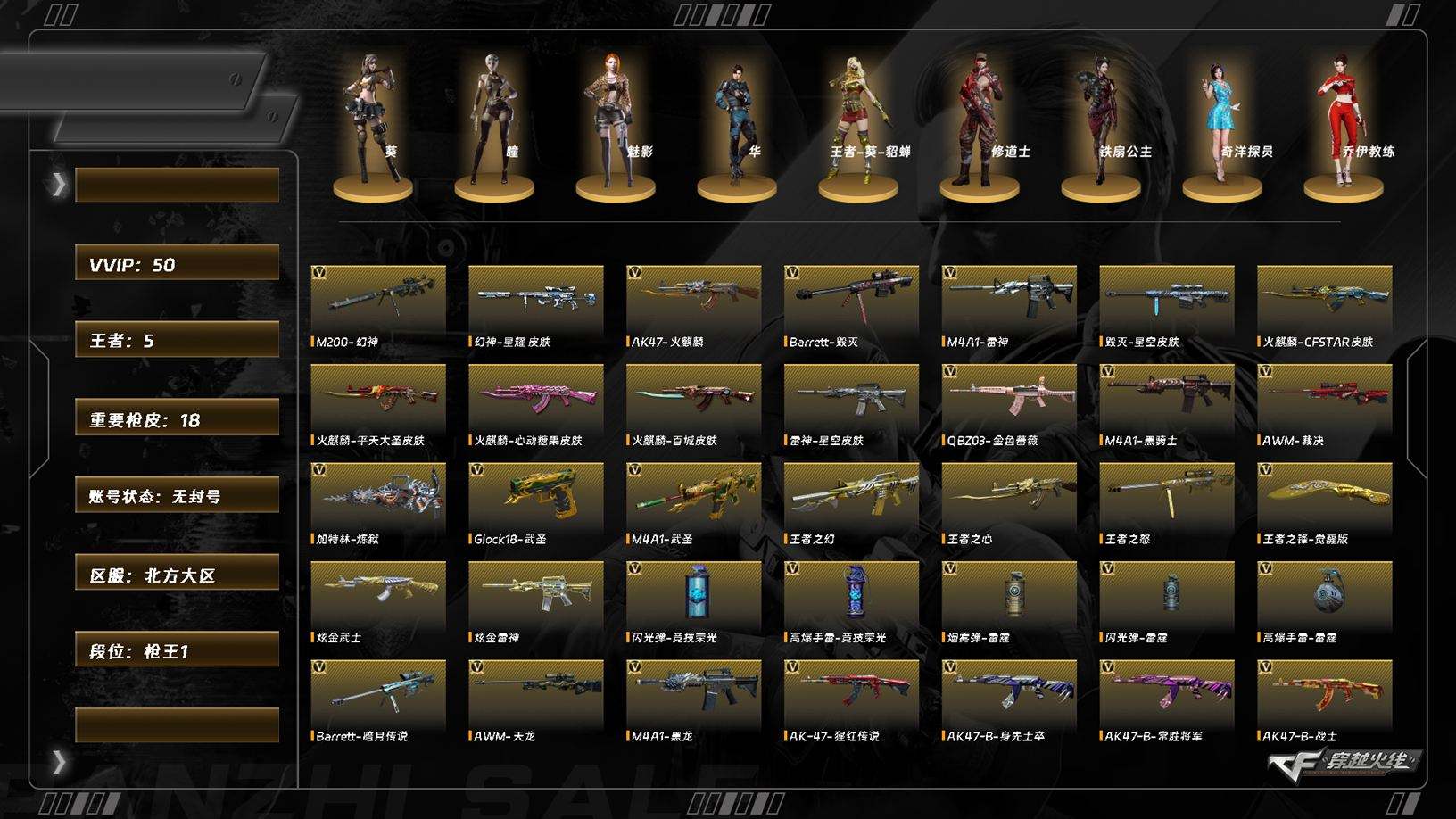 广西一区-2V-0王者-0炫金 【传说武器】:传说灵眸 【热门武器】:传说灵眸,死亡之眼 【音效卡】:Barrett-碧霄极光音效卡 【角色】:乔伊教练,修道士,暗夜-X,娟娟,潘多拉-X,蛇姬,蜀雪 【暴走生化】:死亡之眼,超级对讲机 【英雄级武器】:黑骑士-海王,麒麟刺,M4A1-赤狱骑士 【特殊枪械】:穿越火线 - 南部战区 - 广西