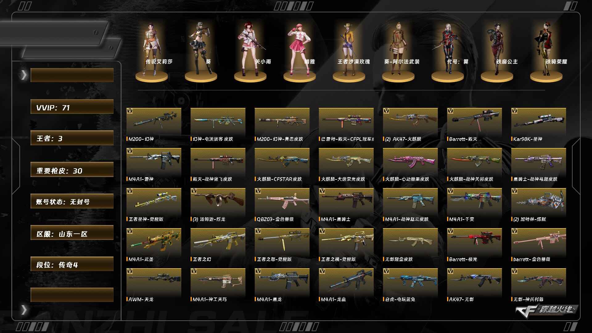 [14488802]ABC9261/北部/山东一区/可二次/可排位/掌火ID:429853029/70V/传说艾莉莎/幻神/幻神电流骇客/幻神黄忠/星神/星神音效卡/王者星神/炽芒蝶刃/QBZ金色蔷薇/白虎电玩蓝兔/USP冥王/【角色】/四防传说艾莉莎/关小雨/雅晴/四防/王者沙漠玫瑰/【音效卡】/黑骑士音效卡/炼狱百战金芒音效卡/【皮肤】/白虎大汉风骨/毁灭战神张飞/毁灭CFPL冠军/黑骑士战神马超/火麒麟战神关羽/麒麟刺萌杀/细节看图穿越火线 - 北部战区 - 山东