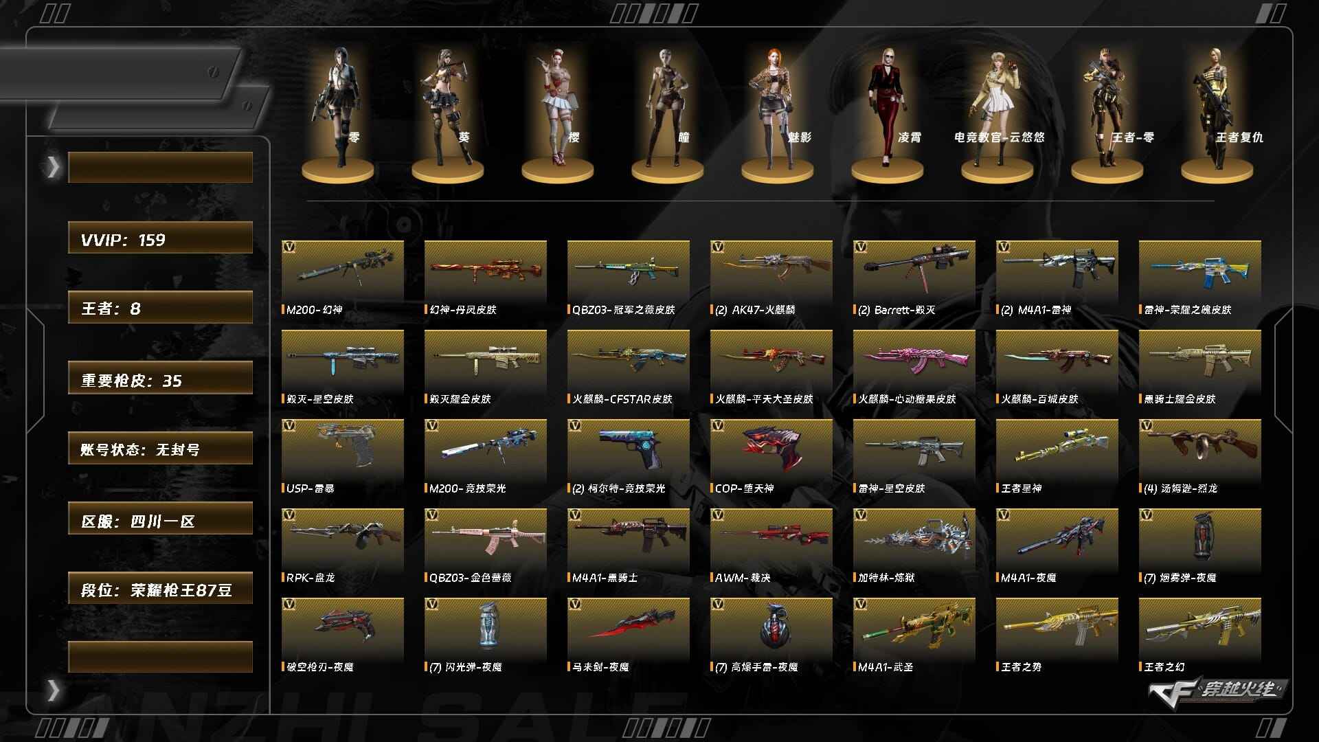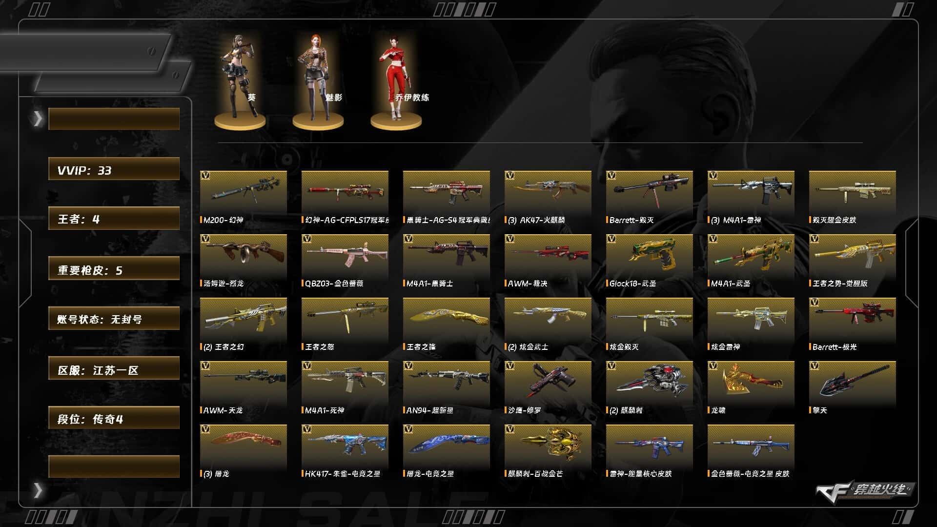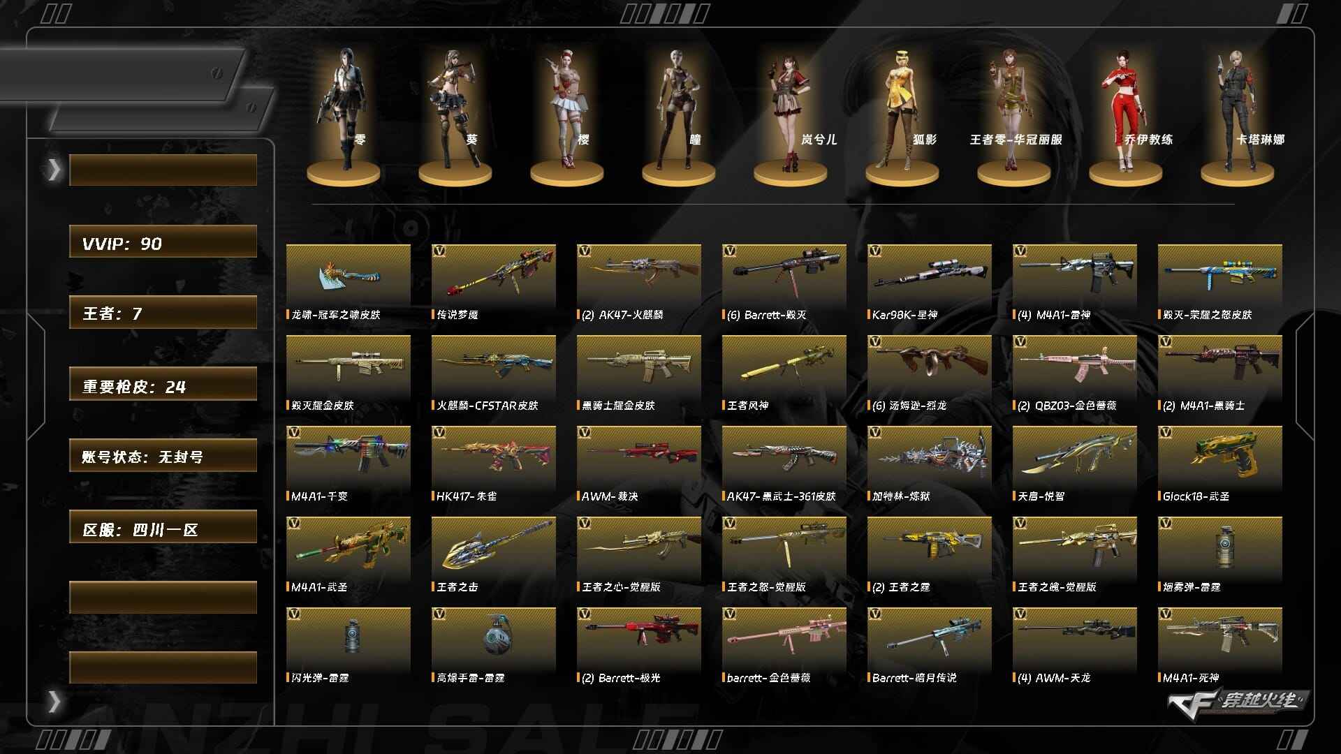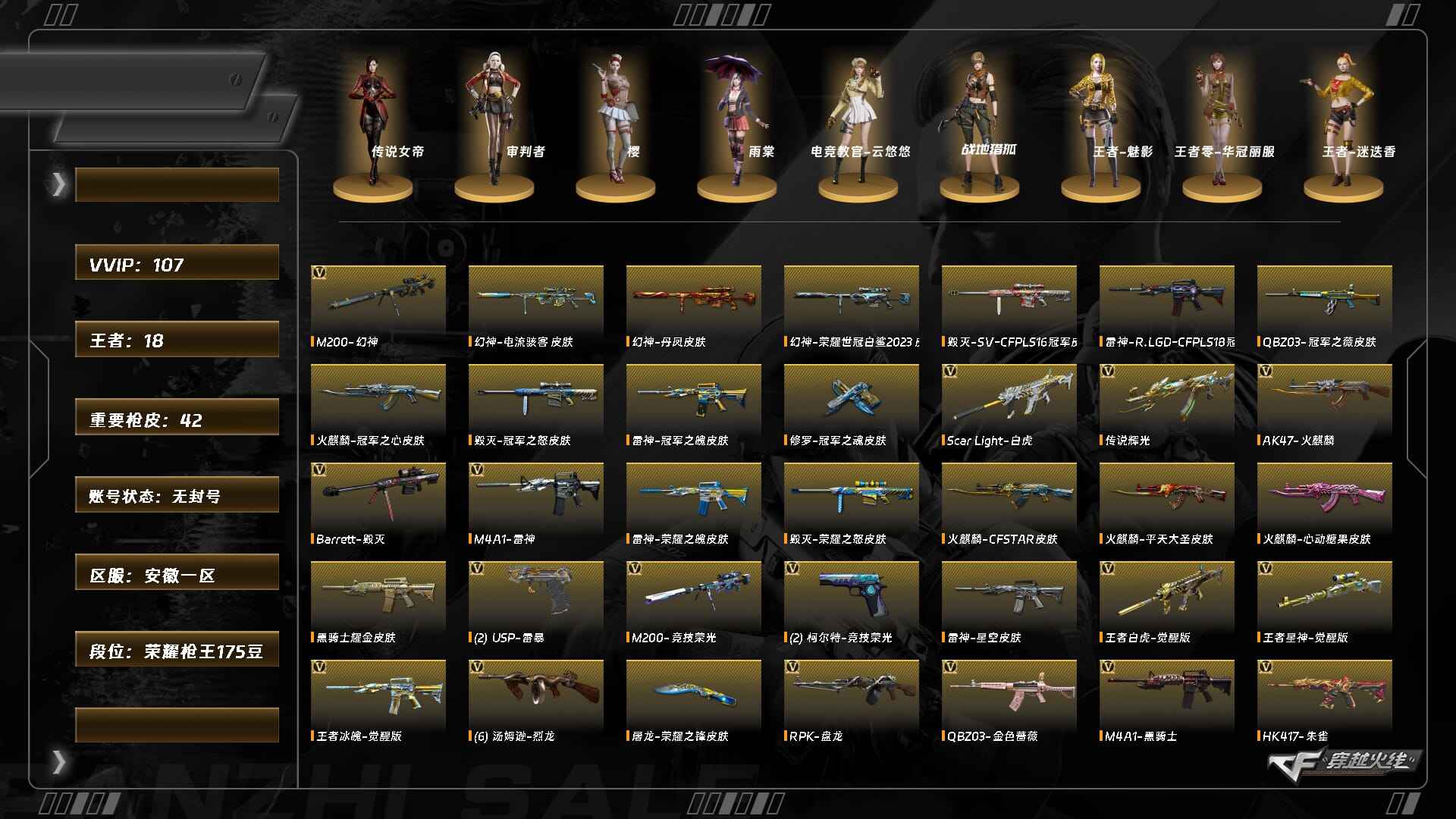 XH7118/西部/四川一区/可排位/【传奇2】【Lv102荣耀元帅】/VIP6/74V/2王者/1炫金/幻神/幻神荣耀世冠白鲨/幻神AGCFPLS24冠军/朱雀/QBZ金色蔷薇/QBZAG冠军/白虎电玩蓝兔/【生化】/6盘龙/6烈龙/斯太尔蝴蝶/*2/4修罗/荣耀世冠柯尔特/*2/麒麟刺百战金芒/三套竞技荣光手雷/【音效卡皮肤】/毁灭音效卡/黑骑士音效卡/雷神音效卡/毁灭冠军之怒/毁灭荣耀之怒/雷神冠军之魄/雷神荣耀之魄/黑骑士冠军之势/黑骑士白马银枪/火麒麟巅峰荣耀/火麒麟荣耀世冠AG/修罗CFS2018/屠龙荣耀之锋/【1个四防角色】/王者春/【角色】/王者瞳闭月羞花/空/葵阿尔法武装/乔伊教练/【玩偶武器】/火麒麟灵狐///各种道具/各种饰品/细节看图/账号封禁过十年已解/穿越火线 - 西部战区 - 四川