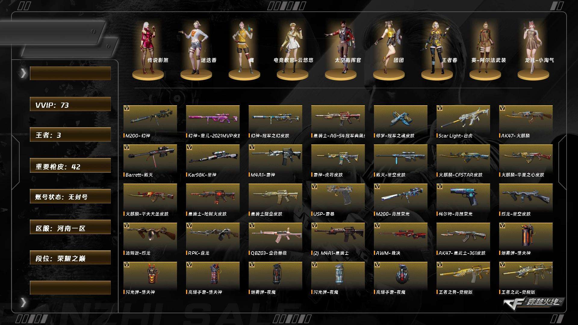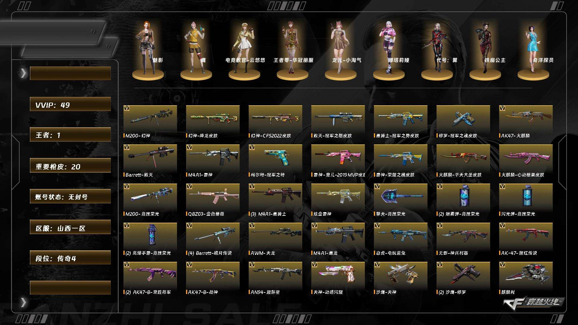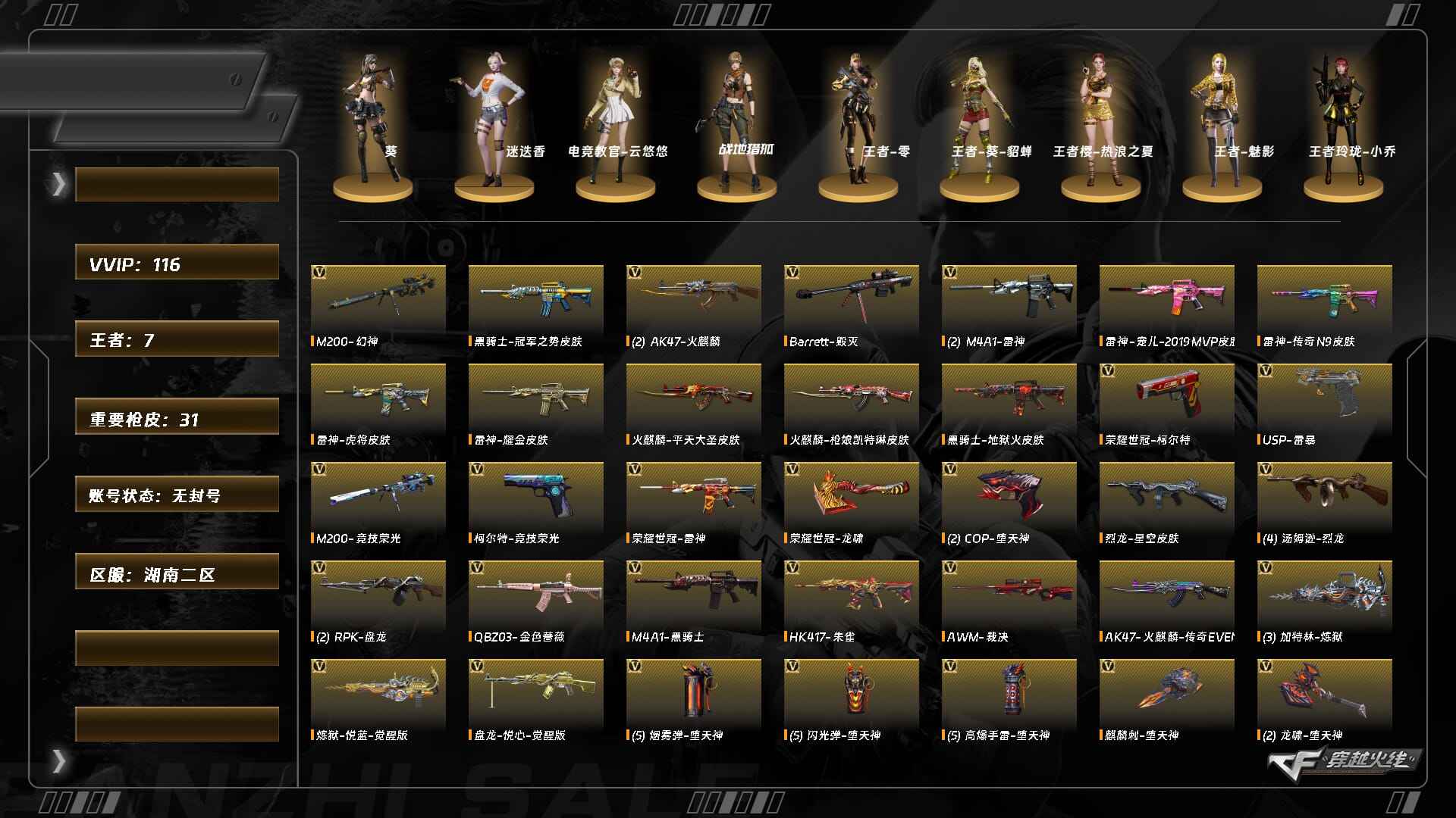SH/广西一区/79V/可排位/可二次/雾蒙蒙/影豹/貂蝉/王者潘多拉/王者涂鸦/职业经理/传说圣灵/传说灵眸/幻灵套/幻神+幻神音效卡+幻神白鲨+幻神AG+幻神N9+幻神宠儿+青鹤+纸灯笼+电流骇客/王者幻神/竞技荣光/白虎/COP幻灵/各种雷套/黑骑士-白虎-毁灭音效卡/火麒麟巅峰荣耀/雷神宠儿/毁灭SV皮肤/★细节看图穿越火线 - 南部战区 - 广西