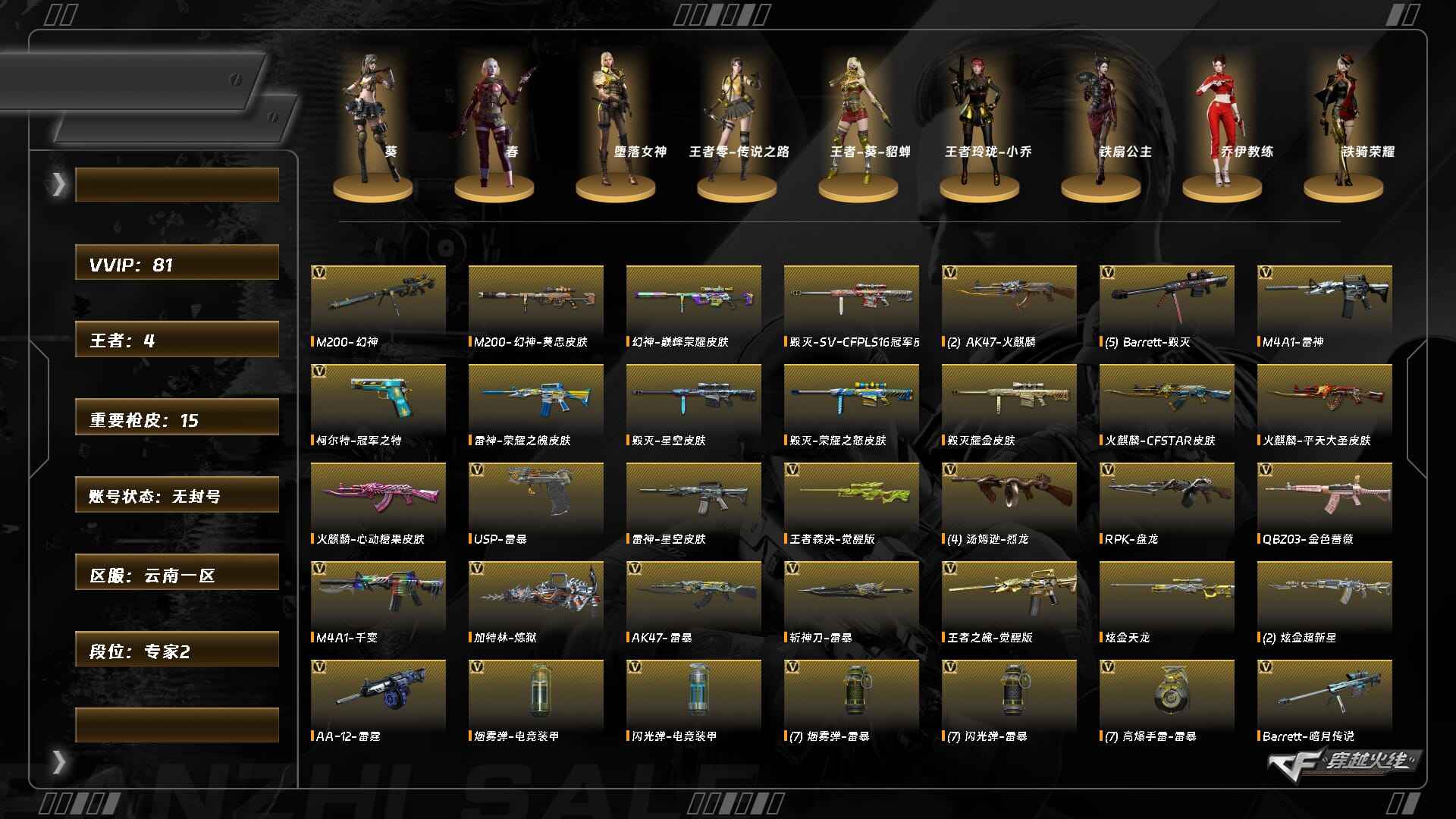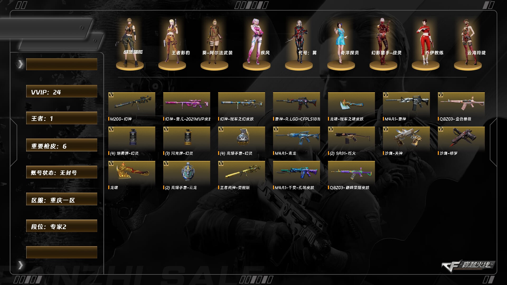 XH7875/西部/重庆一区/可排位/【专家2】/Lv.87 少将6/24V/幻神/幻神宠儿/幻神冠军之幻/王者风神/青龙/QBZ金色蔷薇/QBZ巅峰荣耀/雷神/天神/修罗/迷你深渊冰龙王绿豆/龙啸/三套幻灵手雷/【皮肤】/雷神LGD/龙啸冠军之啸/【四防角色】/王者影豹/【其他角色】/战地猎狐/葵阿尔法武装/奇洋探员/乔伊教练/云海玲珑/零水下丽影///各种道具/各种饰品/细节看图/【此账号未被封过十年】穿越火线 - 西部战区 - 重庆