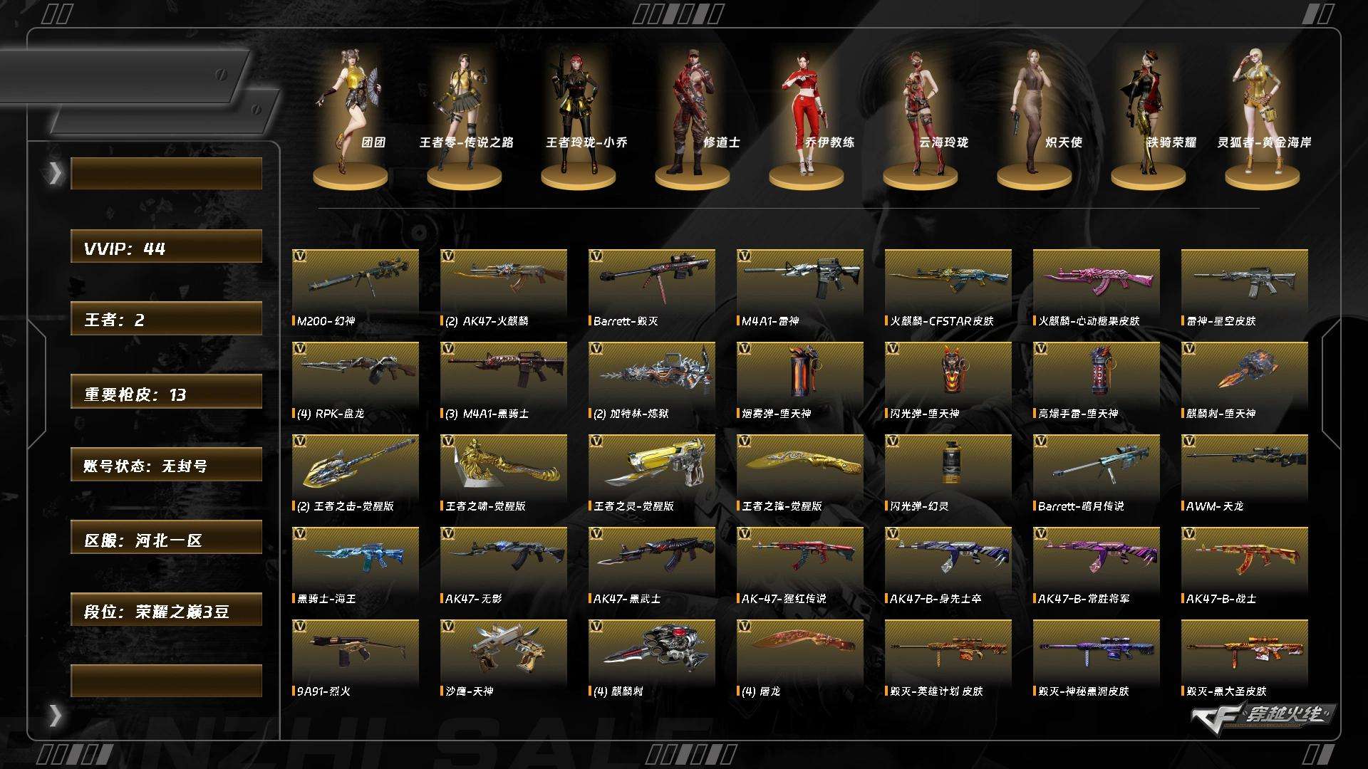 [17831806]XH5663/北部/河北一区/可排位/【荣耀之巅3豆】/【Lv.102 荣耀元帅】/VIP1/42V/幻神/毁灭/雷神/黑骑士/火麒麟/无影/黑武士/盘龙/*4/炼狱/*2/【音效卡】/黑骑士音效卡/【枪皮】/毁灭英雄计划/毁灭神秘黑洞/火麒麟心动糖果/无影能量核心/雷神烈虎/雷神星空/【四防角色】/王者玲珑小乔/【角色】/团团/王者零传说之路/乔伊教练/云海玲珑/炽天使/【道具】/永久超级背包/各种戒指/各种玩偶/永久AC/永久雷包/细节看图/【此账号未被封过十年】穿越火线 - 北部战区 - 河北