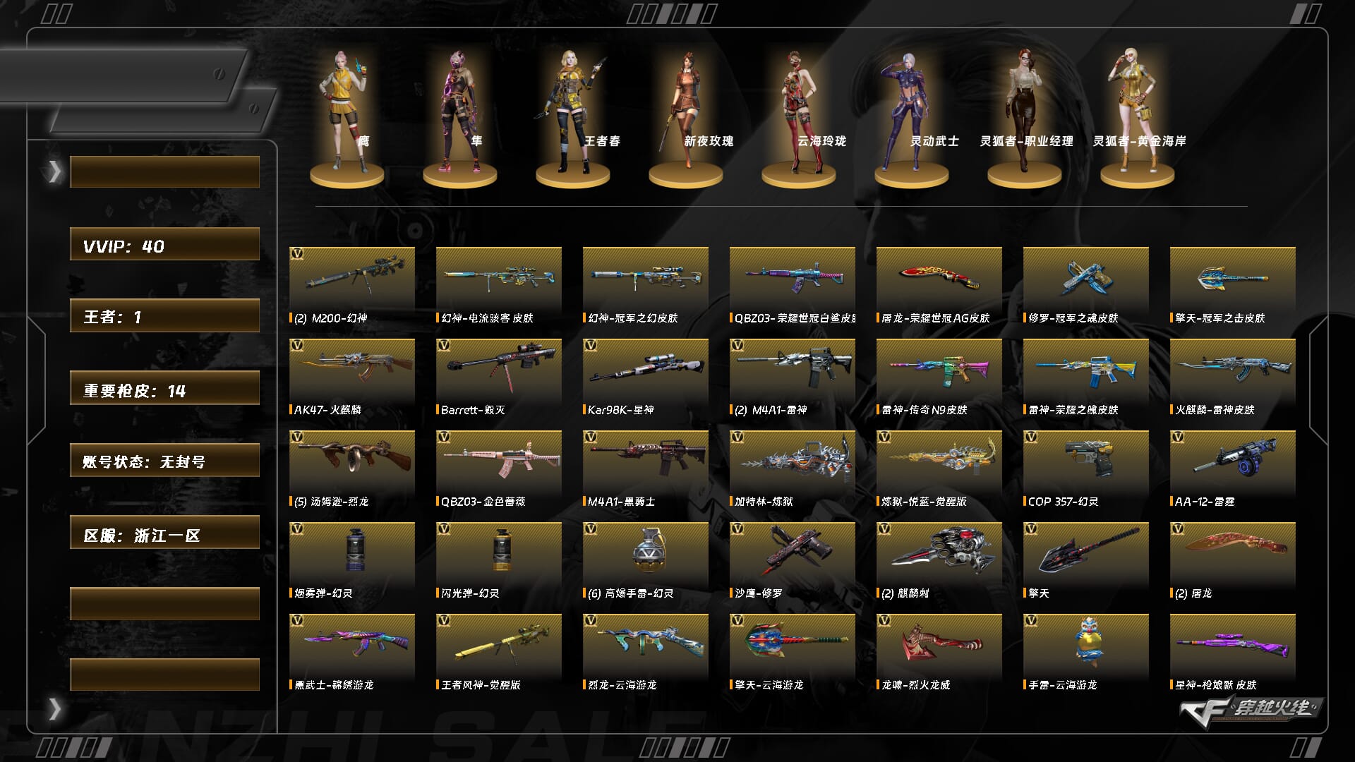 XH8513/东部/浙江一区/可排位/段位未定段/Lv.100 高阶大元帅/40V/双幻神/幻神电流骇客/幻神冠军之幻/星神/星神枪娘默/王者风神/QBZ金色蔷薇/QBZ荣耀世冠白鲨/COP幻灵/烈龙/*5/黑武士锦绣游龙/【音效卡】/炼狱音效卡/【枪皮】/白虎霓虹机甲/裁决百城联赛天津版/火麒麟雷神/雷神传奇N9/雷神荣耀之魄/【四防角色】/王者春/灵狐者职业经理/鹰/隼/【角色】新野玫瑰/云海玲珑/灵狐者黄金海岸/【道具】/永久烟雾头/护目镜/超级背包/各种戒指/各种光效/各种玩偶/永久AC/永久雷包/细节看图/【此账号未被封过十年】/穿越火线 - 东部战区 - 浙江