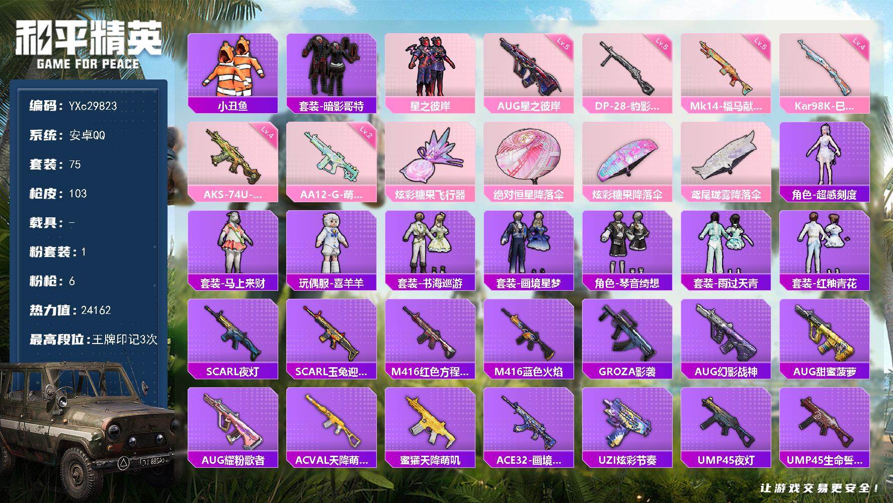 【安卓微信】103套装-153枪皮-0载具 圣域龙灵-瑞拉 梦幻火箭 SCAR-L-锦绣绵绵 GROZA-旋转彩虹 M416-风花雪月 汤姆逊-冰川粉黛 纯白誓言和平精英 - 安卓微信 -