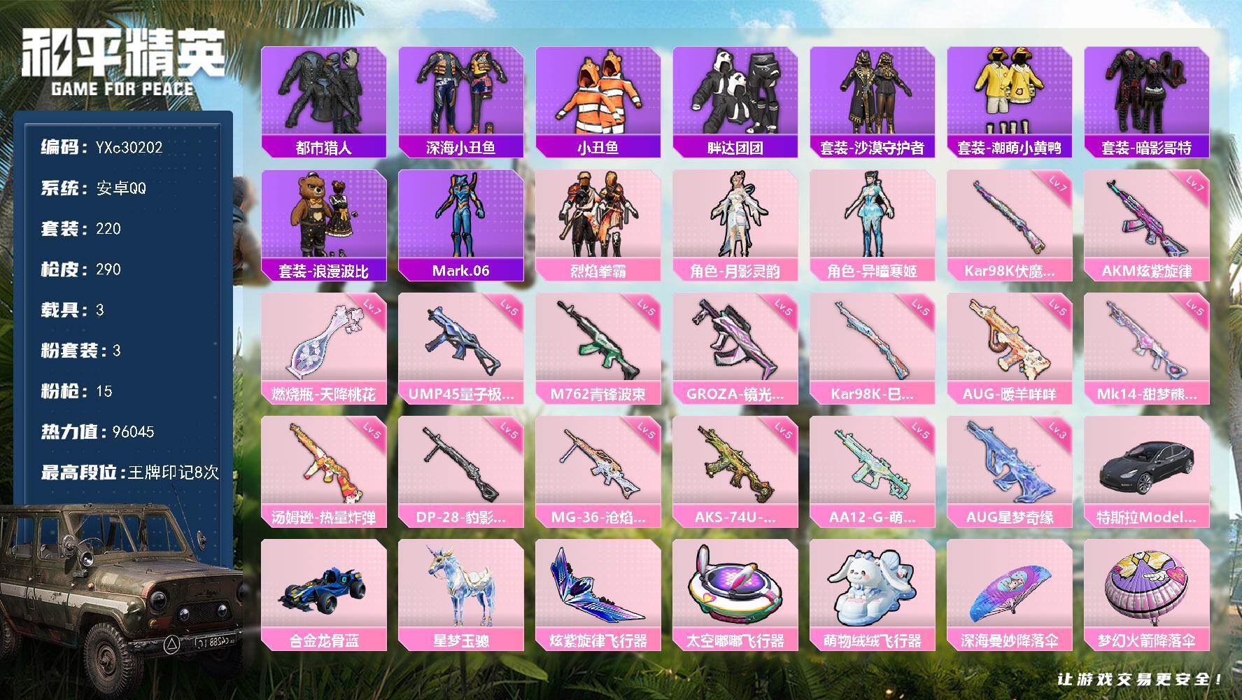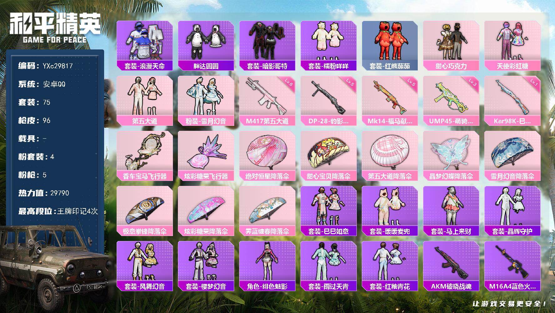 【巧克力 番茄 兔兔 咩咩 胖达 哥特】YXc29817-【无二次协助处理】【因赛季更新游戏段付以上号为准!】 安卓Q-1稀有4粉装5特效枪7热门75套装96枪皮 4印记 历史超级王牌6星 【1稀有】 浪漫天命 【4粉装】 天使彩虹糖 甜心巧克力 雪月幻音 第五大道 【5特效枪】 Kar98K-巳巳如意 (1级) DP-28-豹影疾电 (5级) M417-第五大道 (6级) Mk14-福马献瑞 (5级) UMP45-萌骑冒险 (3级) 【7热门】 红熊茄茄 晶辉守护 糯粉咩咩 兔兔白日梦 胖达圆圆 暗影哥特 破蛋小黄鸡 【1头盔】 甜心宝贝头盔 【1背包】 甜心宝贝背包