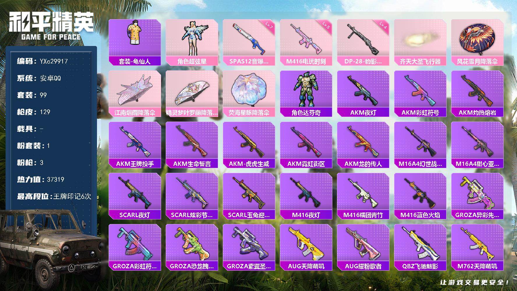 【满地铁天赋】YXc29917-【可二次】【因赛季更新游戏段付以上号为准!】 安卓Q-1粉装3特效枪6热门99套装129枪皮 6印记 历史超级王牌4星 【1粉装】 超弦星 【3特效枪】 M416-电玩时刻 (5级) DP-28-豹影疾电 (4级) SPAS-12-音爆索尼克 (7级) 【6热门】 龟仙人 ACT战队服 团圆交子 瑞龙福将 英勇保护者 M762-瑞龙福将 【1飞行器】 齐天大圣飞行器 【1头盔】 夏日绵绵冰头盔