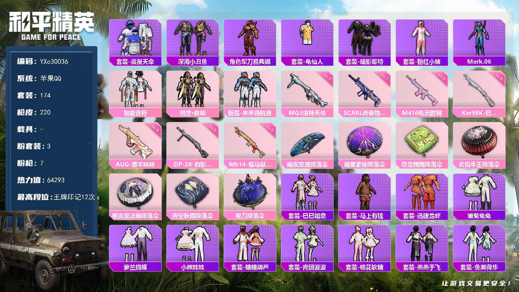【苹果微信】109套装-150枪皮-1载具 苹果微信-【送苹果微信王者】1王牌印记-4粉装-4特效枪-1载具-49325热力值-109套装-150枪皮