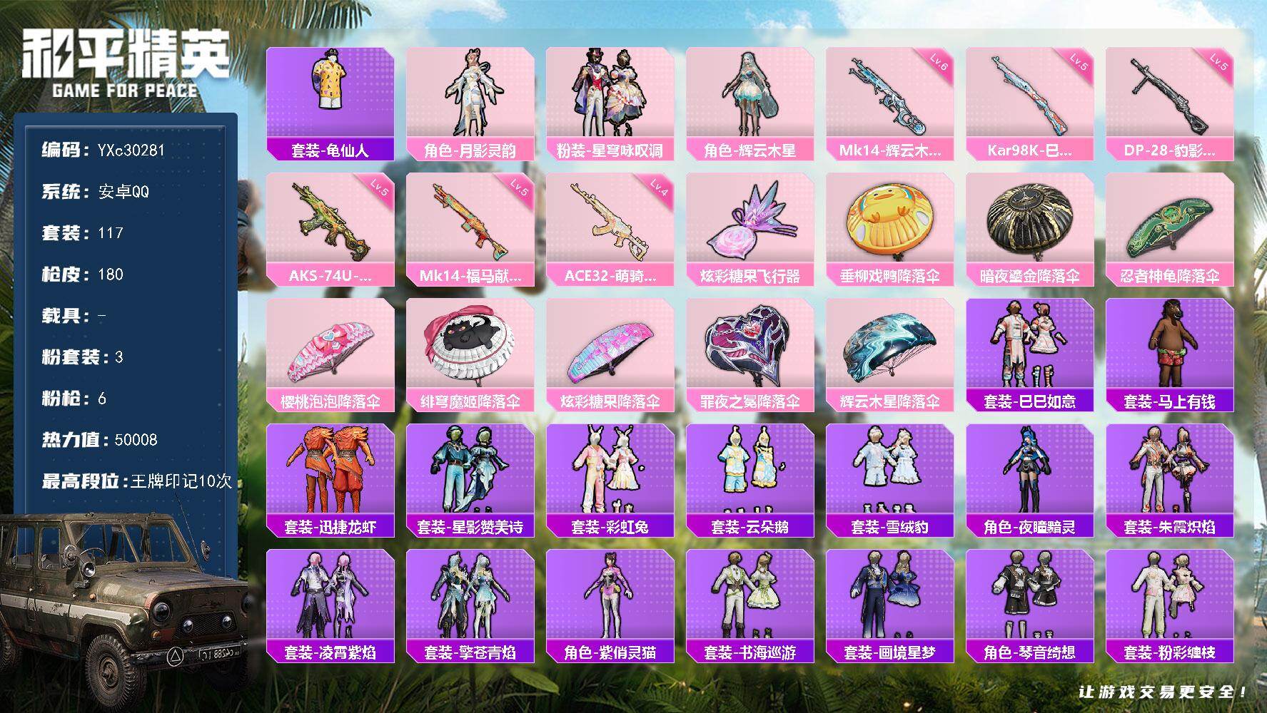 【满地铁天赋】YXc30281-【可二次】【因赛季更新游戏段付以上号为准!】 安卓Q-3粉装6特效枪2热门117套装180枪皮 10印记 历史超级王牌7星 【3粉装】 辉云木星 月影灵韵 星穹咏叹调 【6特效枪】 AKS-74U-森灵之息 (5级) Kar98K-巳巳如意 (5级) DP-28-豹影疾电 (5级) MK14-辉云木星 (6级) Mk14-福马献瑞 (5级) ACE32-萌骑漫游 (4级) 【2热门】 龟仙人 破蛋小黄鸡