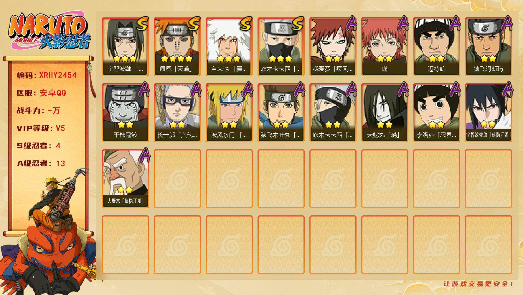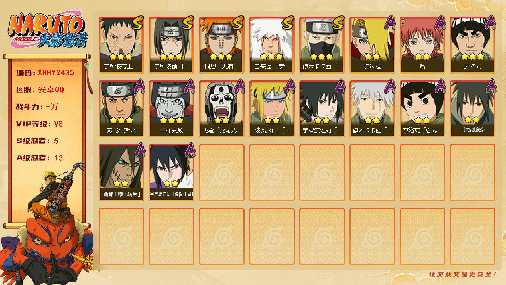[13818451]Xr42900-安卓v区-无二次-5S级忍者数-11A级忍者数【S级忍者】:宇智波斑「秽土转生·解」(3星),宇智波鼬「须佐能乎」(3星),自来也「舞之豪杰」(3星),自来也「传说中的三忍」(3星),佩恩「天道」(3星)【A级忍者】:波风水门「青年」(2星),干柿鬼鲛(2星),漩涡博人「桃式显现」(2星),旗木卡卡西「幻之真容」(2星),我爱罗「疾风传」(2星),蝎(2星),蝎「绯流琥」(2星),宇智波鼬(2星),宇智波佐助「须佐能乎」(2星),秋道丁次「忍界大战」(2星),宇智波泉奈(2星)火影忍者 - 安卓微信 -
