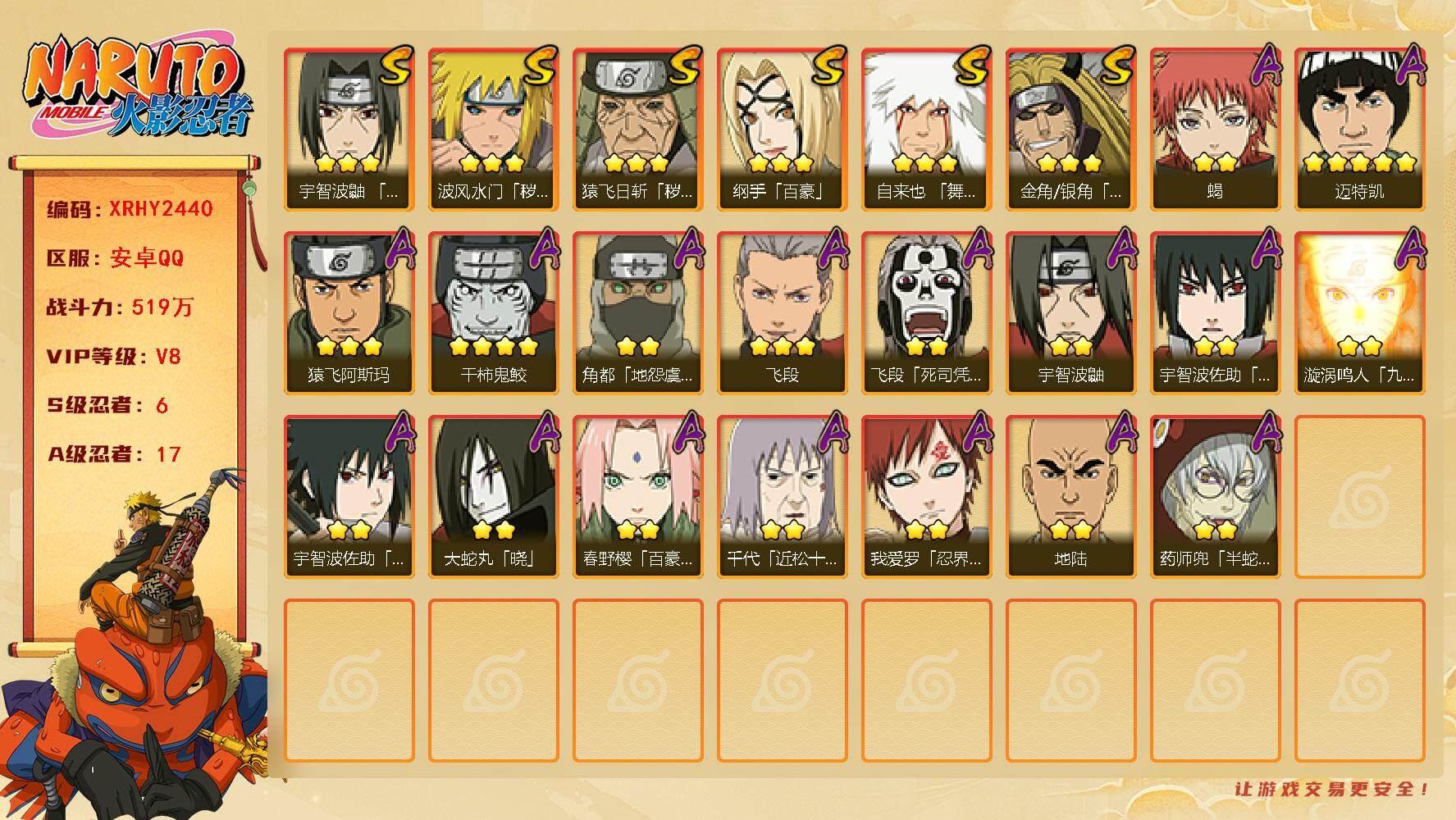 [13885771]Xr43360-战力519W-安Q-6S级忍者数-17A级忍者数【S级忍者】:金角·银角「秽土转生」(3星),猿飞日斩「秽土转生」(3星),波风水门「秽土转生」(3星),宇智波鼬「须佐能乎」(3星),自来也「舞之豪杰」(3星),纲手「百豪」(3星)【A级忍者】:大蛇丸「晓」(2星),飞段(3星),飞段「死司凭血」(2星),干柿鬼鲛(4星),漩涡鸣人「九尾查克拉」(2星),迈特凯(5星),我爱罗「忍界大战」(2星),蝎(2星),角都「地怨虞」(2星),猿飞阿斯玛(3星),宇智波鼬(2星),宇智波佐助「须佐能乎」(2星),宇智波佐助「万花筒写轮眼」(2星),药师兜「半蛇斗篷」(2星),春野樱「百豪」(2星),千代「近松十人卫」(2星),地陆(2星)