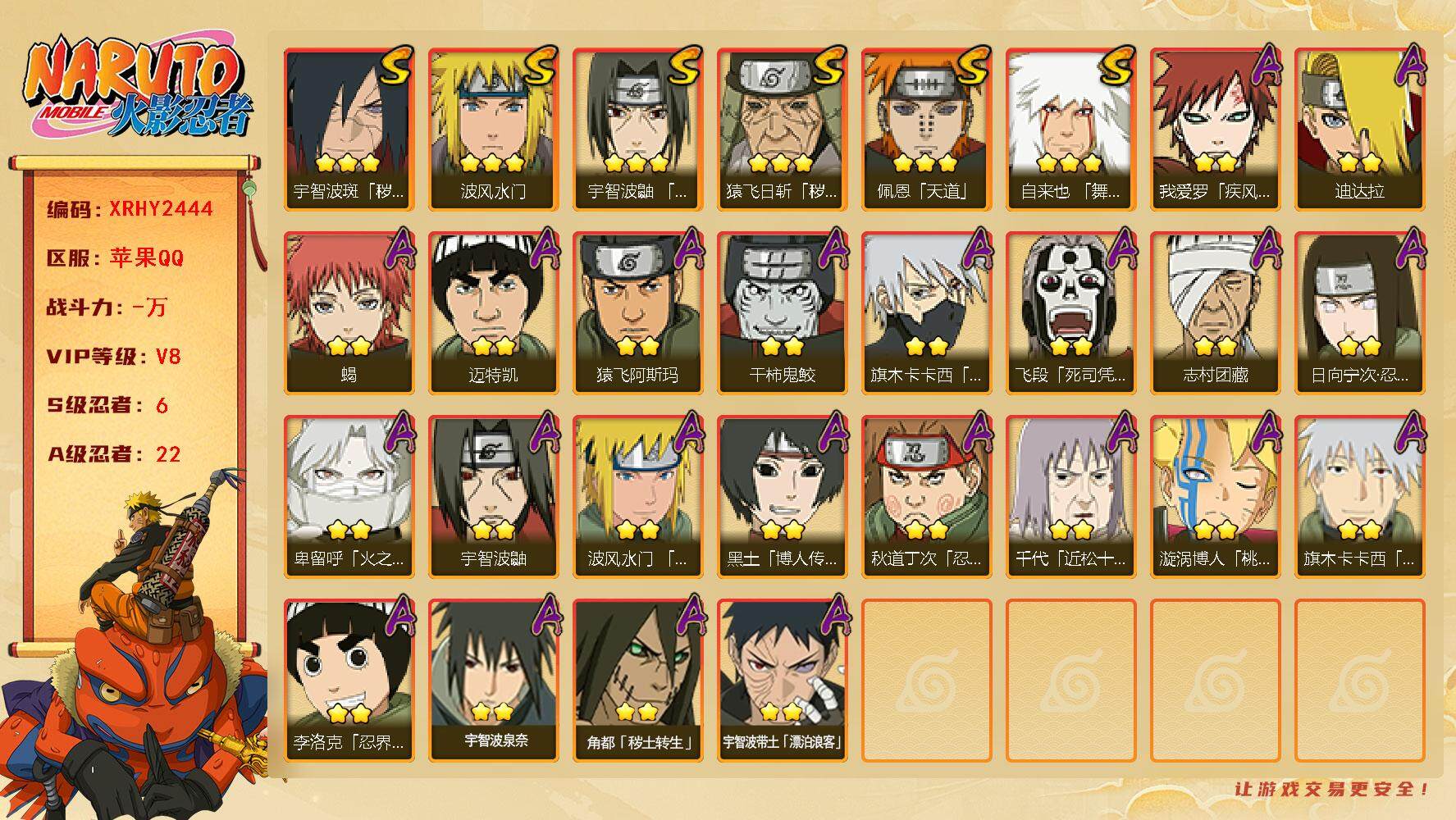 [13885593]Xr45052-果Q-可二次-6S级忍者数-22A级忍者数【S级忍者】:猿飞日斩「秽土转生」(3星),宇智波斑「秽土转生·解」(3星),宇智波鼬「须佐能乎」(3星),自来也「舞之豪杰」(3星),波风水门(3星),佩恩「天道」(3星)【A级忍者】:波风水门「青年」(2星),迪达拉(2星),飞段「死司凭血」(2星),干柿鬼鲛(2星),漩涡博人「桃式显现」(2星),迈特凯(2星),旗木卡卡西「万花筒写轮眼」(2星),旗木卡卡西「幻之真容」(2星),我爱罗「疾风传」(2星),蝎(2星),角都「秽土转生」(2星),猿飞阿斯玛(2星),宇智波鼬(2星),日向宁次「忍界大战」(2星),宇智波带土「漂泊浪客」(2星),卑留呼「火之意志继承者」(2星),李洛克「忍界大战」(2星),黑土「博人传」(2星),秋道丁次「忍界大战」(2星),千代「近松十人卫」(2星),志村团藏(2星),宇智波泉奈(2星)火影忍者 - 苹果QQ -