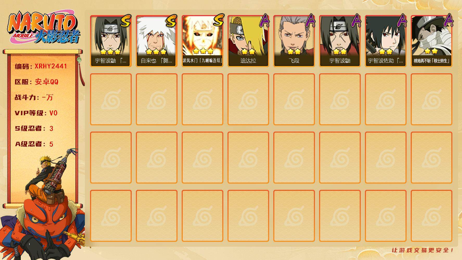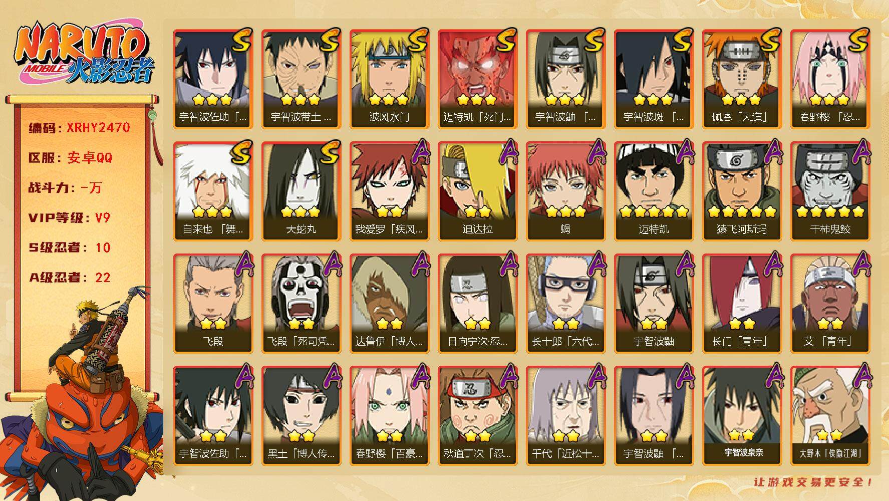 [13885735]Xr45002-安q-可二次-3S级忍者数-5A级忍者数【S级忍者】:宇智波鼬「须佐能乎」(3星),自来也「舞之豪杰」(3星),波风水门「九喇嘛连结」(3星)【A级忍者】:迪达拉(2星),飞段(2星),桃地再不斩「秽土转生」(2星),宇智波鼬(2星),宇智波佐助「须佐能乎」(2星)火影忍者 - 安卓QQ -