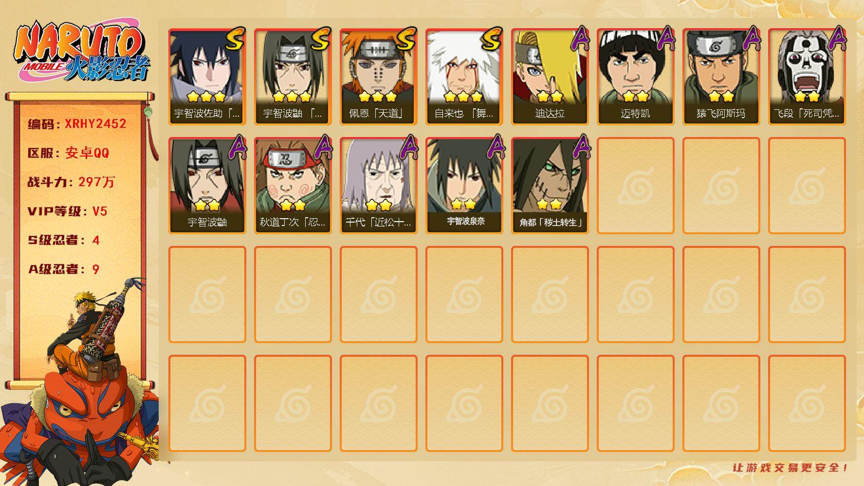 [14117372]Xr45415-战力297W-安Q-4S级忍者数-9A级忍者数【S级忍者】:宇智波鼬「须佐能乎」(3星),自来也「舞之豪杰」(3星),佩恩「天道」(3星),宇智波佐助「永恒万花筒」(3星)【A级忍者】:迪达拉(2星),飞段「死司凭血」(2星),迈特凯(2星),角都「秽土转生」(2星),猿飞阿斯玛(2星),宇智波鼬(2星),秋道丁次「忍界大战」(2星),千代「近松十人卫」(2星),宇智波泉奈(2星)火影忍者 - 安卓QQ -