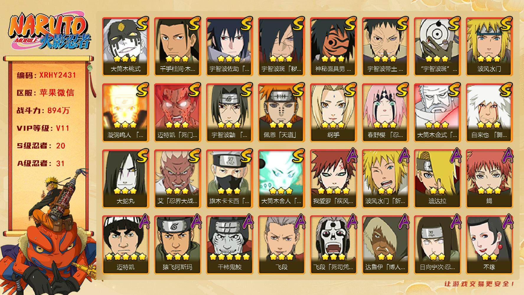[14117515]Xr44549-果V-20S级忍者数-31A级忍者数【S级忍者】:宇智波斑「秽土转生·解」(3星),春野樱「忍界大战」(3星),宇智波带土「忍界大战」(3星),艾「忍界大战」(3星),宇智波鼬「须佐能乎」(3星),旗木卡卡西「须佐能乎」(3星),千手柱间「木叶创立」(3星),自来也「舞之豪杰」(3星),大蛇丸(3星),纲手(3星),波风水门(3星),神秘面具男「红夜之刃」(3星),漩涡鸣人「九喇嘛连结」(3星),迈特凯「死门」(3星),佩恩「天道」(3星),宇智波佐助「永恒万花筒」(3星),宇智波斑 「白面具」(3星宇智波斑「白面具」),大筒木金式(3星),大筒木桃式(3星),大筒木舍人「最终章」(3星)【A级忍者】:艾「青年」(2星),长门「青年」(2星),波风水门「青年」(2星),波风水门「新春限定」(2星),达鲁伊「博人传」(2星),迪达拉(2星),迪达拉「秽土转生」(2星),大蛇丸「晓」(2星),飞段(3星),飞段「死司凭血」(3星),干柿鬼鲛(5星),漩涡博人「桃式显现」(2星),迈特凯(5星),我爱罗「疾风传」(4星),蝎(3星),蝎「绯流琥」(2星),角都「秽土转生」(2星),猿飞阿斯玛(3星),宇智波鼬(2星),宇智波佐助「须佐能乎」(2星),宇智波佐助「万花筒写轮眼」(2星),日向宁次「忍界大战」(2星),日向雏田「最终章」(2星),宇智波带土「漂泊浪客」(2星),长十郎「六代目水影」(2星),李洛克「忍界大战」(2星),春野樱「百豪」(2星),秋道丁次「忍界大战」(2星),千代「近松十人卫」(2星),不缘(2星),宇智波泉奈(2星)火影忍者 - 苹果微信 -