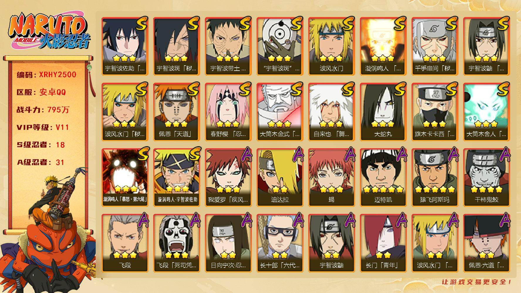 [15505235]xr47602-安q-可二次-18S级忍者数-33A级忍者数【S级忍者】:长门「秽土转生」(3星),宇智波鼬「秽土转生」(3星),宇智波斑「秽土转生·解」(3星),大野木「忍界大战」(3星),艾「忍界大战」(3星),宇智波鼬「须佐能乎」(3星),宇智波止水「须佐能乎」(3星),旗木卡卡西「须佐能乎」(3星),千手柱间「木叶创立」(3星),自来也「舞之豪杰」(3星),自来也「传说中的三忍」(3星),波风水门(3星),神秘面具男「红夜之刃」(3星),漩涡鸣人「九喇嘛连结」(3星),佩恩「天道」(3星),宇智波佐助「永恒万花筒」(3星),大筒木金式(3星),漩涡鸣人「暴怒·第六尾」(3星)【A级忍者】:艾「青年」(2星),波风水门「新春限定」(2星),飞段(3星),飞段「死司凭血」(2星),干柿鬼鲛(5星),漩涡博人「桃式显现」(2星),漩涡鸣人「九尾查克拉」(2星),迈特凯(3星),旗木卡卡西「万花筒写轮眼」(2星),旗木卡卡西「幻之真容」(2星),桃地再不斩「漂泊武士」(2星),桃地再不斩「秽土转生」(2星),我爱罗「疾风传」(3星),我爱罗「忍界大战」(2星),蝎(4星),小南「漂泊浪客」(2星),猿飞阿斯玛(3星),照美冥「五代目水影」(2星),日向宁次「忍界大战」(2星),日向雏田「最终章」(2星),宇智波带土「漂泊浪客」(2星),长十郎「六代目水影」(2星),卑留呼「火之意志继承者」(2星),佩恩·六道「漂泊浪客」(2星),李洛克「忍界大战」(2星),黑土「博人传」(2星),勘九郎「忍界大战」(2星),春野樱「百豪」(2星),秋道丁次「忍界大战」(2星),千代「近松十人卫」(2星),神农「羁绊」(2星),宇智波泉奈(2星),不动(2星)火影忍者 - 安卓QQ -