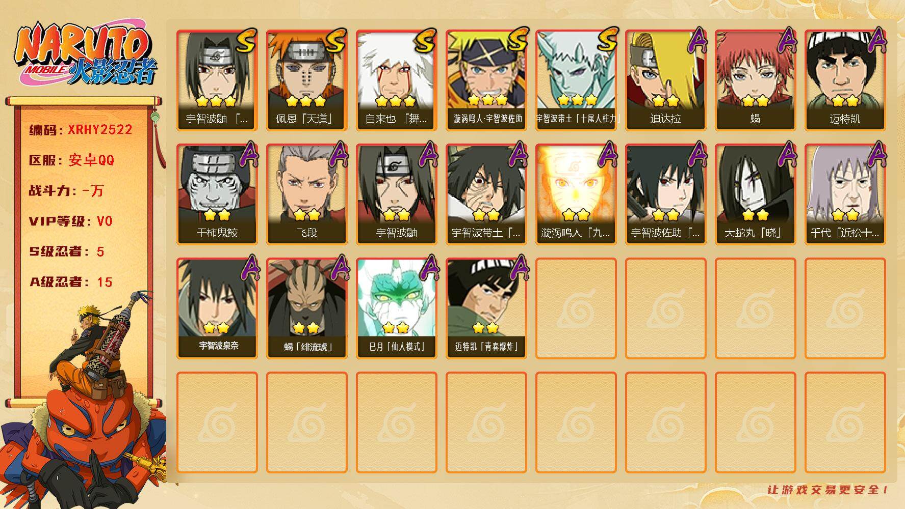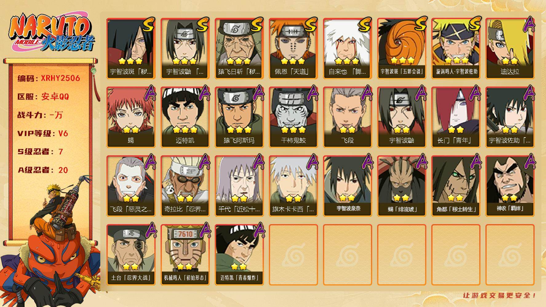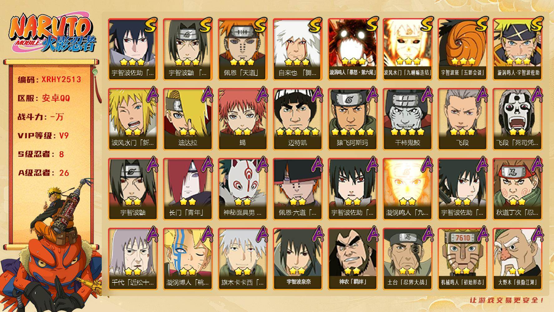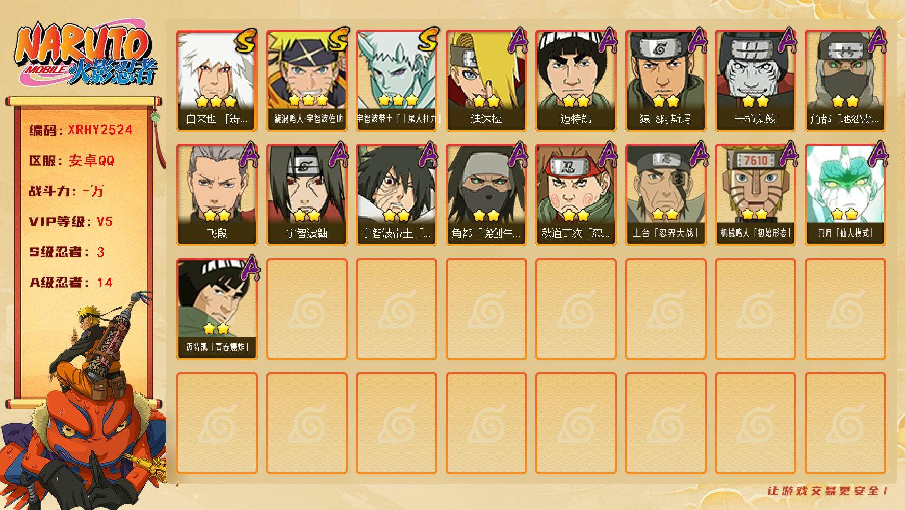 [16145153]XR49084-安卓-QQ-无二次-2S级忍者数-6A级忍者数【S级忍者】:宇智波斑「五影会谈」(3星),漩涡鸣人·宇智波佐助(3星)【A级忍者】:机械鸣人「初始形态」(2星),迈特凯(2星),宇智波鼬(2星),神秘面具男「忍者之路」(2星),千代「近松十人卫」(2星),迈特凯「青春爆炸」(2星)火影忍者 - 安卓QQ -
