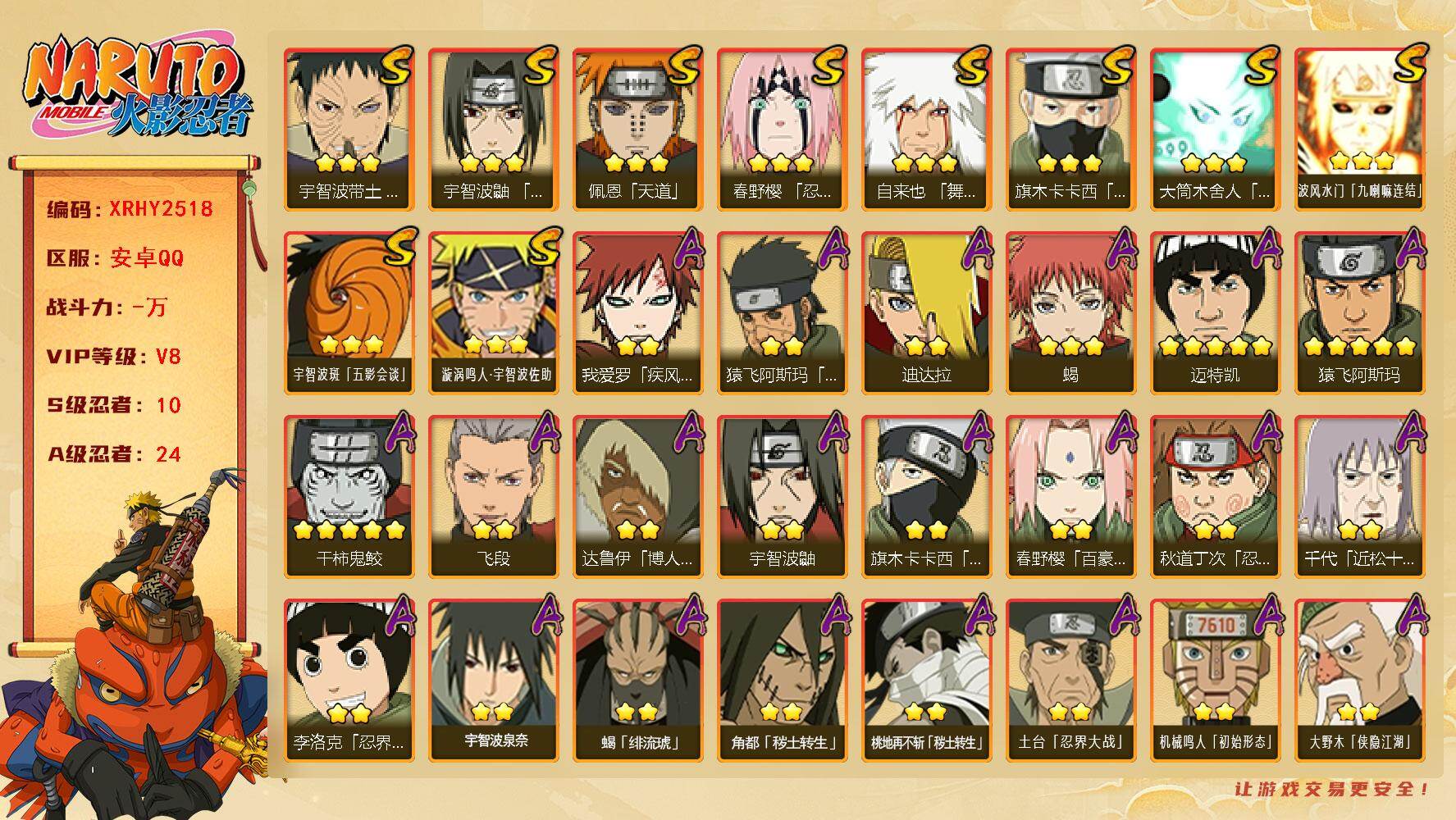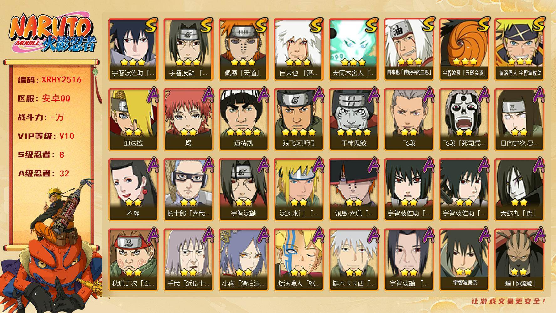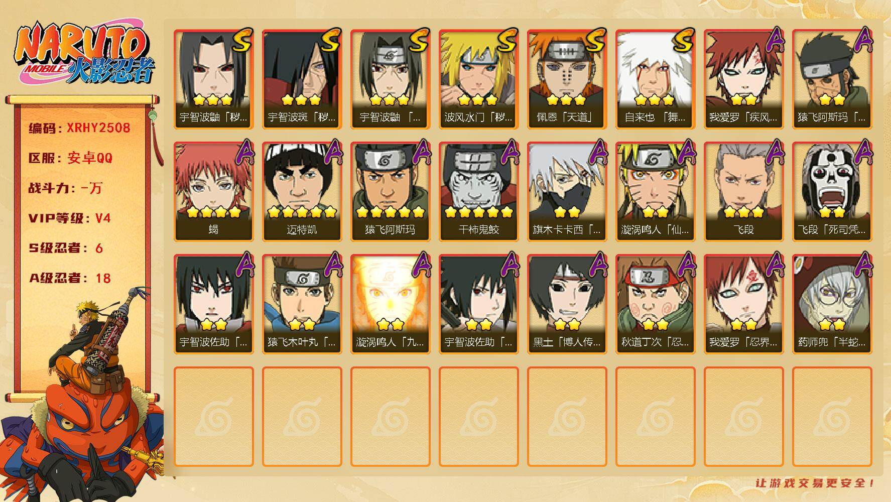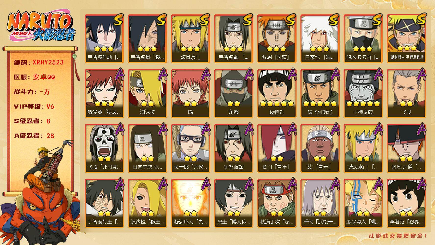 [16145153]XR49084-安卓-QQ-无二次-2S级忍者数-6A级忍者数【S级忍者】:宇智波斑「五影会谈」(3星),漩涡鸣人·宇智波佐助(3星)【A级忍者】:机械鸣人「初始形态」(2星),迈特凯(2星),宇智波鼬(2星),神秘面具男「忍者之路」(2星),千代「近松十人卫」(2星),迈特凯「青春爆炸」(2星)火影忍者 - 安卓QQ -