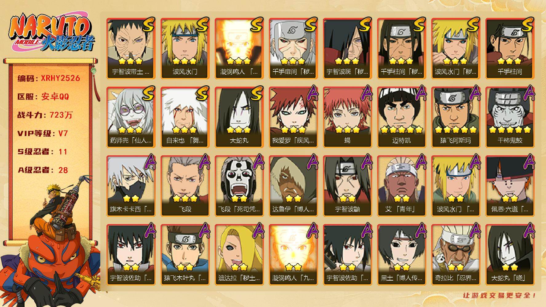 [16440141]Xr49675-可修改-战力723W-安Q-11S级忍者数-28A级忍者数【S级忍者】:波风水门「秽土转生」(3星),千手扉间「秽土转生」(3星),千手柱间「秽土转生」(3星),宇智波斑「秽土转生」(3星),宇智波带土「忍界大战」(3星),自来也「舞之豪杰」(3星),大蛇丸(3星),千手柱间(3星),波风水门(3星),药师兜「仙人模式」(3星),漩涡鸣人「九喇嘛连结」(3星)【A级忍者】:艾「青年」(2星),波风水门「青年」(2星),达鲁伊「博人传」(2星),迪达拉「秽土转生」(2星),大蛇丸「晓」(2星),奇拉比「忍界大战」(2星),飞段(3星),飞段「死司凭血」(2星),干柿鬼鲛(5星),漩涡鸣人「九尾查克拉」(2星),迈特凯(5星),旗木卡卡西「万花筒写轮眼」(2星),我爱罗「疾风传」(3星),我爱罗「忍界大战」(2星),蝎(3星),猿飞阿斯玛(5星),猿飞日斩「火影继承人」(2星),宇智波鼬(2星),宇智波佐助「须佐能乎」(2星),宇智波佐助「万花筒写轮眼」(2星),药师兜「半蛇斗篷」(2星),照美冥「五代目水影」(2星),佩恩·六道「漂泊浪客」(2星),猿飞木叶丸「博人传」(2星),黑土「博人传」(2星),秋道丁次「忍界大战」(2星),千代「近松十人卫」(2星),地陆(2星)火影忍者 - 安卓QQ -