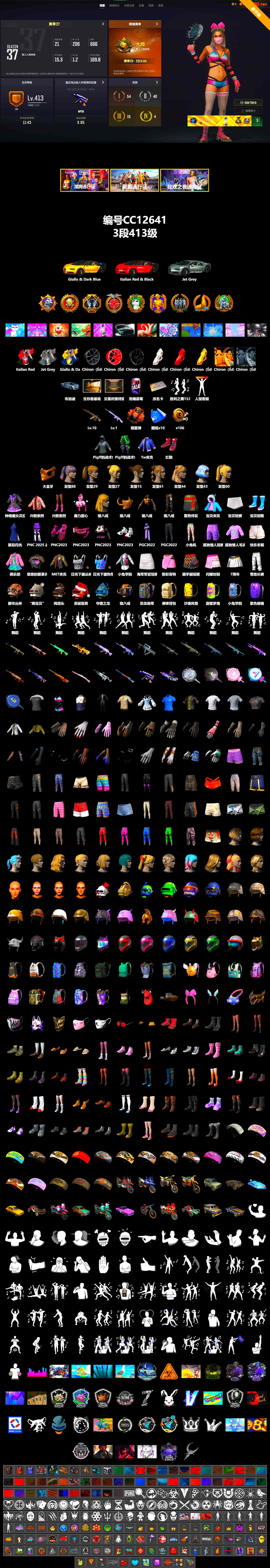 CC12641/可排位/3段/413级/10张图纸/烟雾弹/改名卡/布加迪/10级妖魔ACE/1级玩偶大炮/金面/双马尾/丸子头/脏辫绝地求生 - 全区服 -