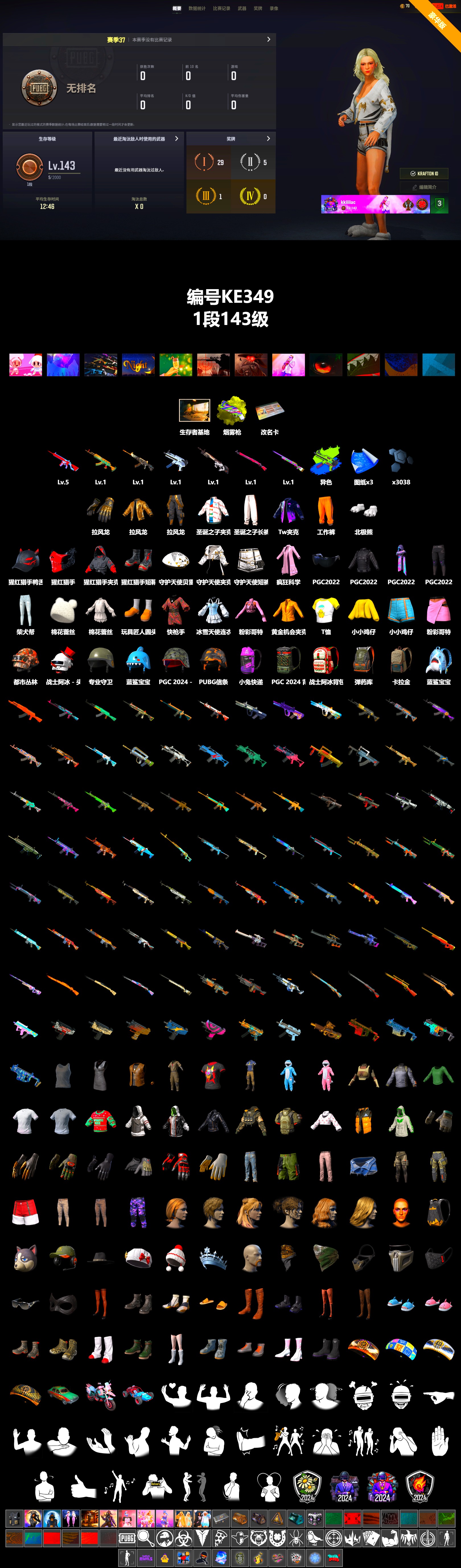 KE349/可排位/1段/143级/7神器/5级无信号M4/1级水麒麟/1级恶魔ACE/1级赛博MK12/1级彩虹之上M24/1级午夜惊魂98K/1级无重力MPK5/烟枪/其他细节看图/ KE349/可排位/1段/143级/7神器/5级无信号M4/1级水麒麟/1级恶魔ACE/1级赛博MK12/1级彩虹之上M24/1级午夜惊魂98K/1级无重力MPK5/烟枪/其他细节看图/绝地求生 - 全区服 -
