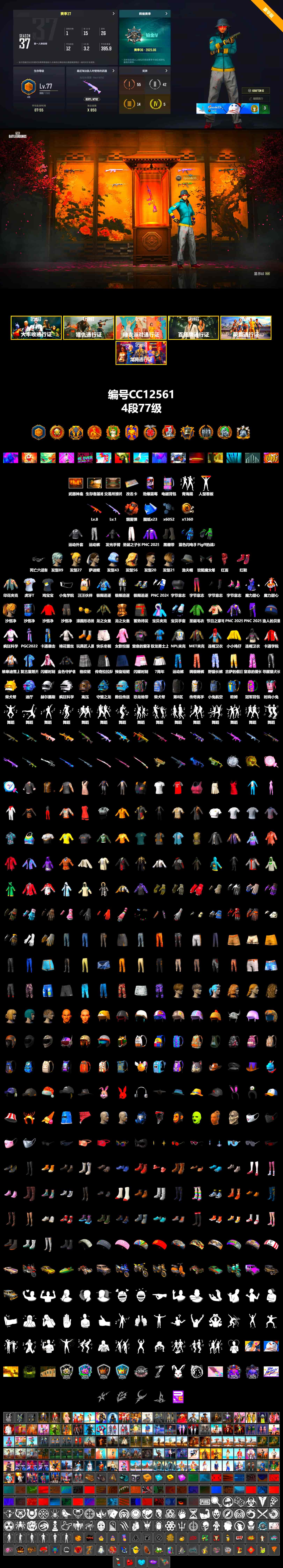 CC12561/可排位/4段/77级/改名卡/23张图纸/6000聚合物/1400蜗牛币/烟雾弹/8级南瓜M4/1级玩偶大炮/电磁背包/染血运动裤/丸子头/婚纱头/渔夫帽绝地求生 - 全区服 -