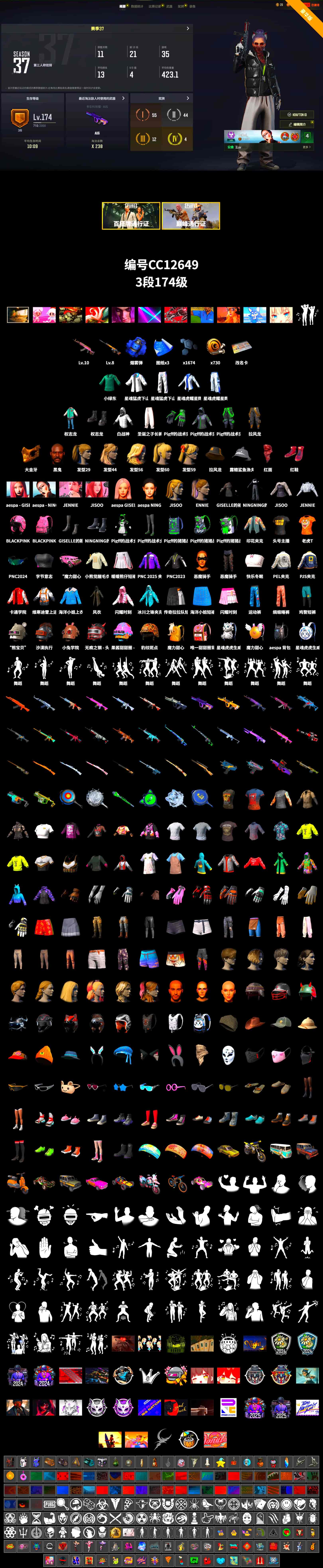 CC12649/可排位/3段/174级/改名卡/3张图纸/烟雾弹/10级火麒麟/8级齿轮大炮/2套3代女团/2套1代女团/绿东/2星魂套装/权志龙套装/白战神/pigff套装/金面/黑鬼/双马尾绝地求生 - 全区服 -