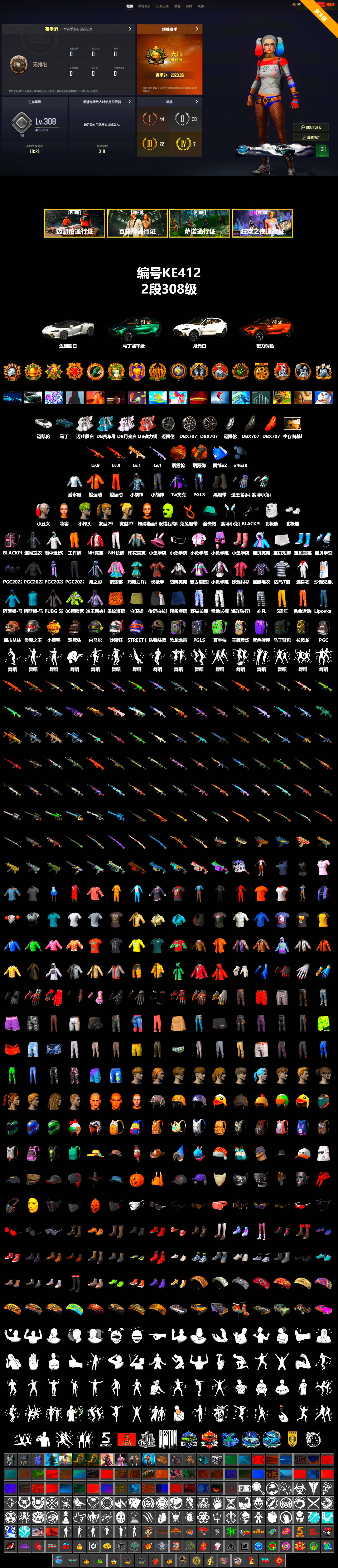 KE412/可排位/可直接绑定/2段/308级/4500聚合物/白色迈凯伦/白色阿斯顿马丁SUV/9级南瓜M4/9级铃儿响叮当MIN14/1级危险玩偶SLR/1级亚特兰蒂斯DBS/橘色烟雾/小丑女套装/其他细节看图/绝地求生 - 全区服 -