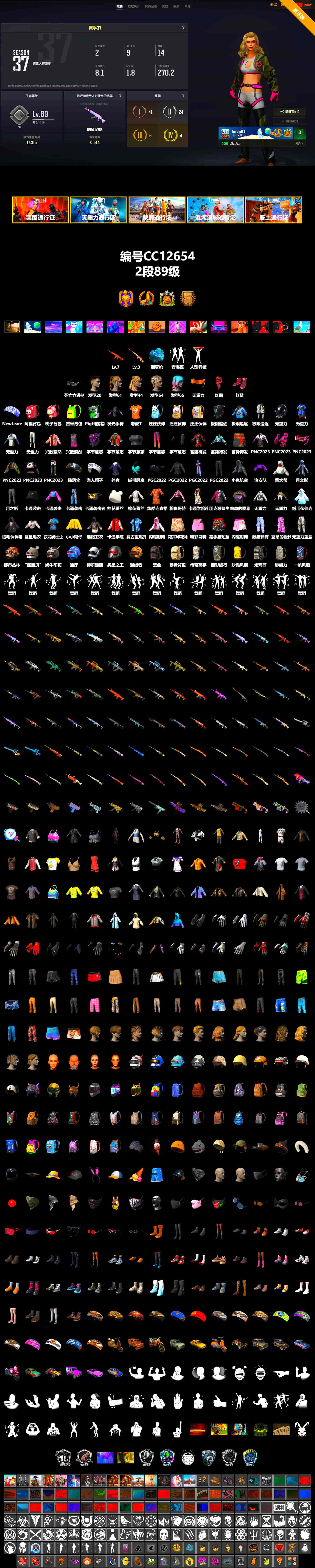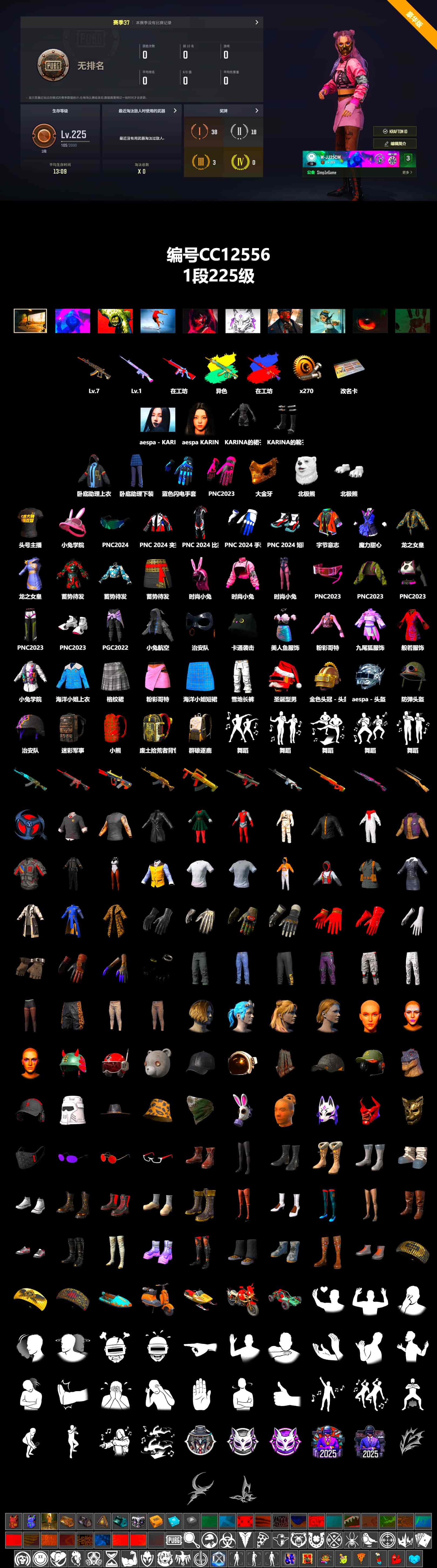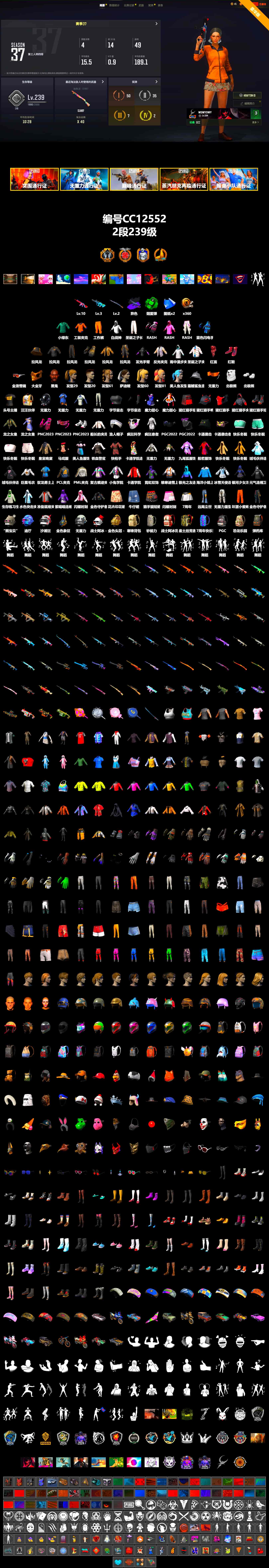 CC12552/可排位/2段/239级/2张图纸/烟雾弹/10级无信号M4/3级权志龙AUG/2级猛虎98k/无信号M4异色/绿东/黄东/白战神/粉战神/拉风龙套装/金面/黑鬼/双马尾/婚纱头/白熊