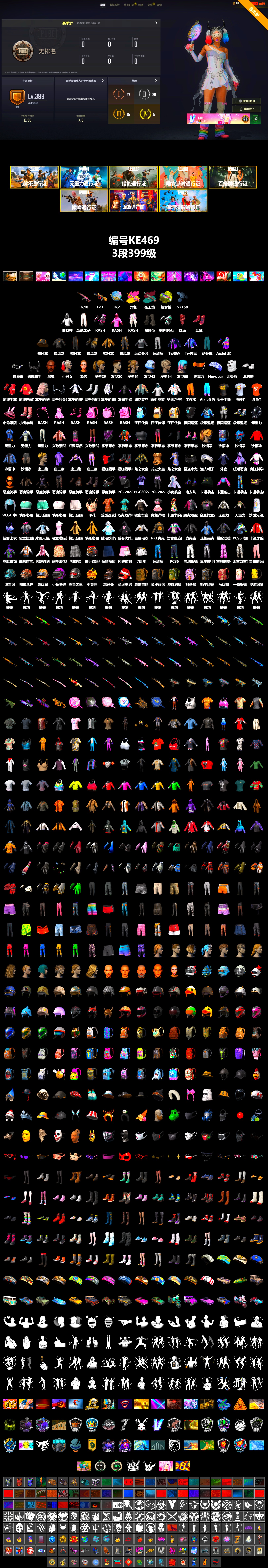 KE469/可排位/3段/399级/10级火麒麟/2级赛壬平底锅/1级弥诺陶洛斯AUG/红面巾/小丑女套装/黑大吉大利T/柏林鞋/双马尾/其他细节看图/