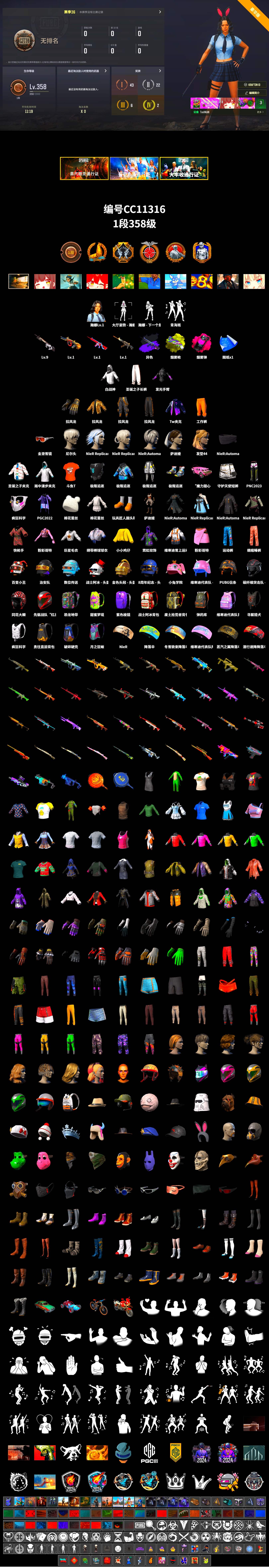 CC11316/可排位/1段/358级/1张图纸/烟枪/烟雾弹/翰娜/9级赛博MK12/1级弥诺陶洛斯AUG/1级无信号M4/1级恶魔ACE/无信号M4异色/白战神/拉风龙套装/尼尔头/婚纱头绝地求生 - 全区服 -
