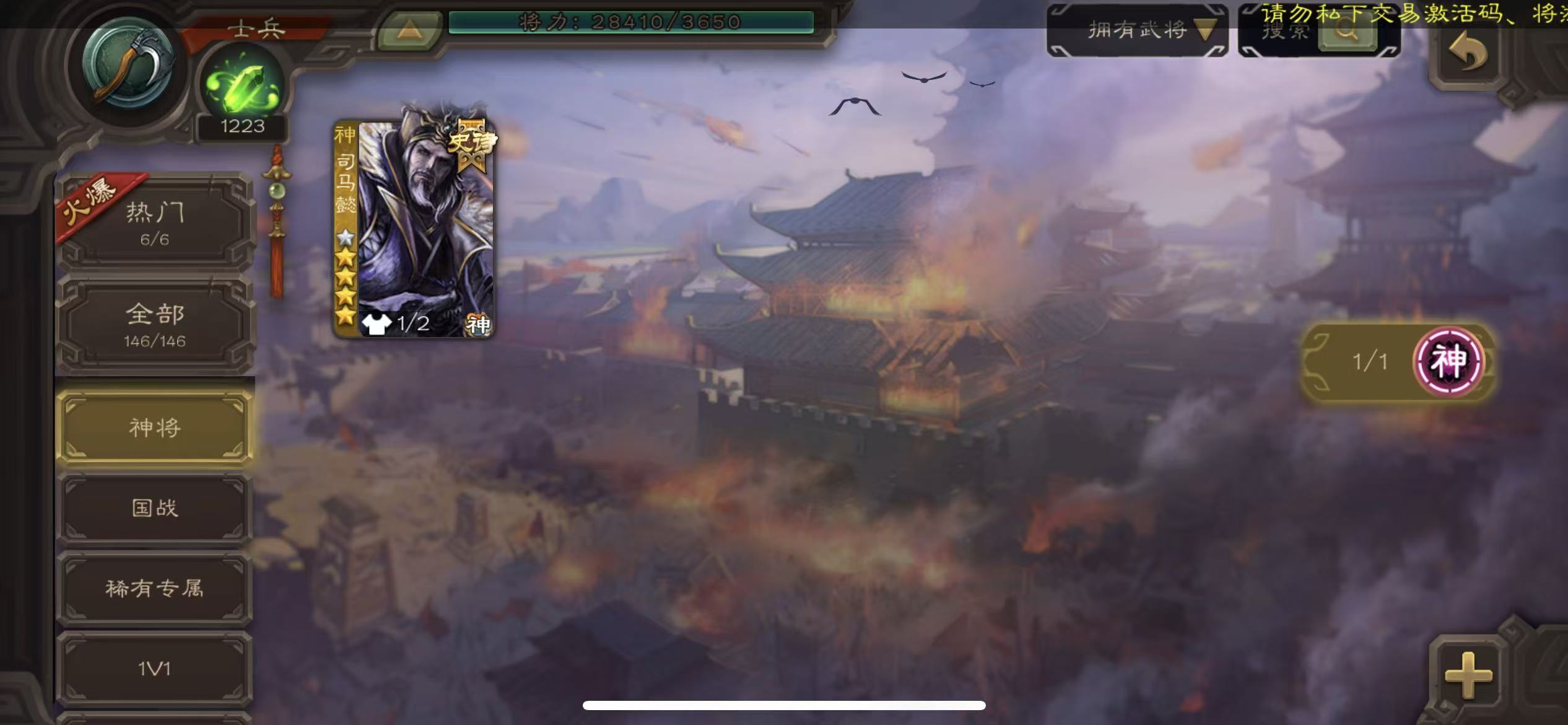 先锋动态神司马懿花花1.47万将魂三卡
