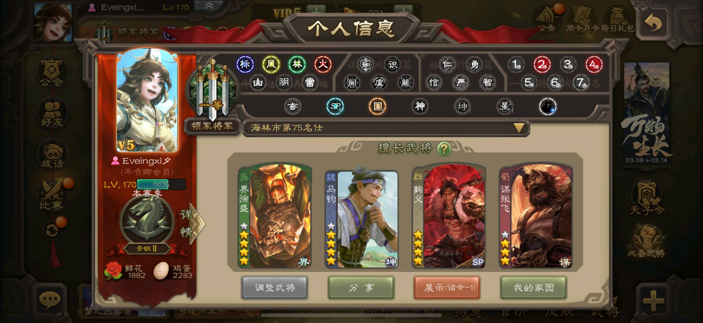 [代售]年卡已开,权一强将,排位武将齐全,巅峰赛,斗地主,军八爽玩,史诗武将多,最值大将军号,神赵新皮肤,羽毛六万多。 三卡充足。