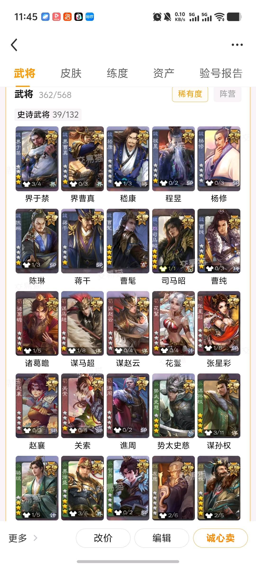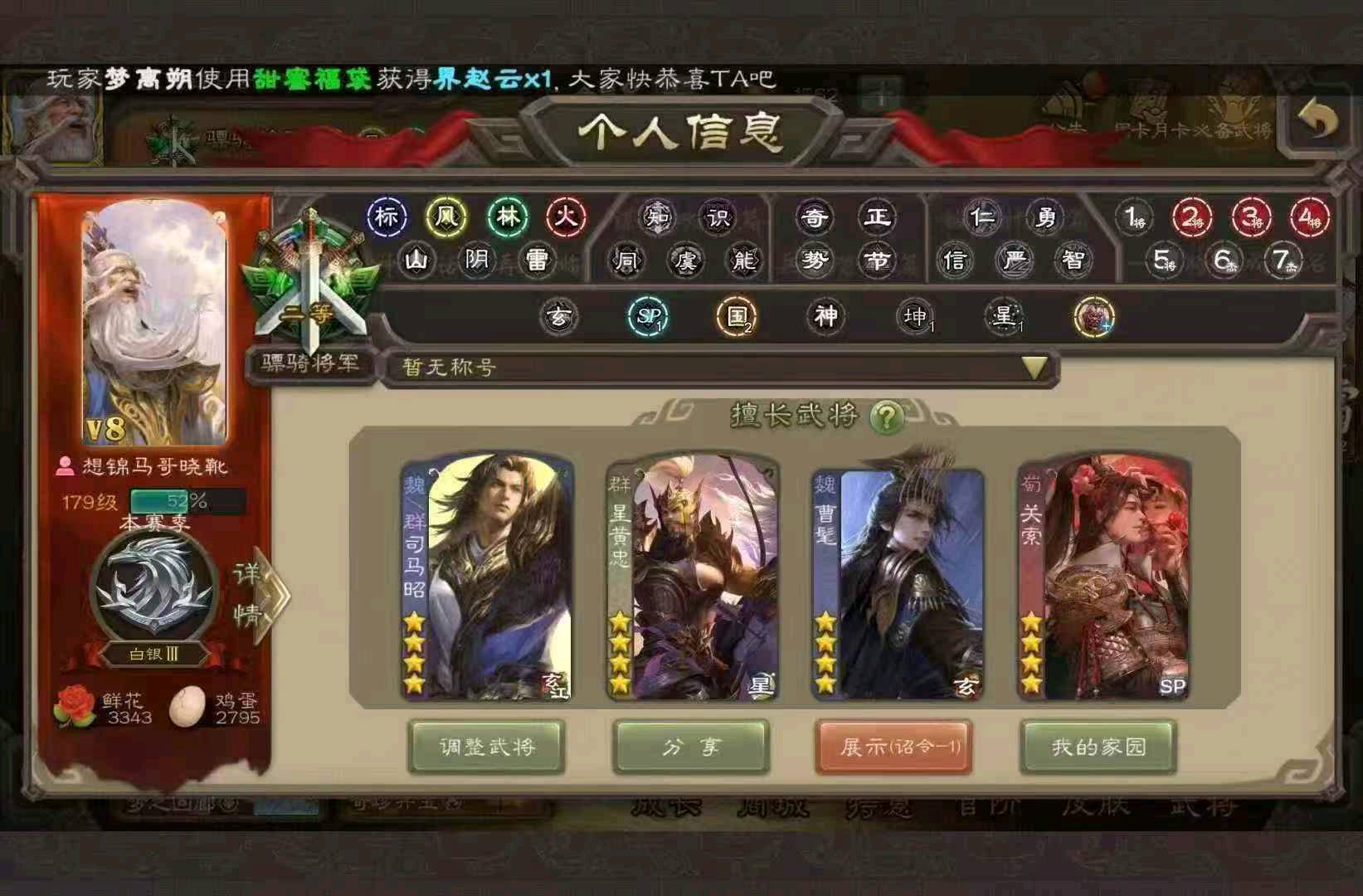 [代售]年卡已开,权一强将,排位武将齐全,巅峰赛,斗地主,军八爽玩,史诗武将多,最值大将军号,神赵新皮肤,羽毛六万多。 三卡充足。三国杀 - 三国杀移动版 -