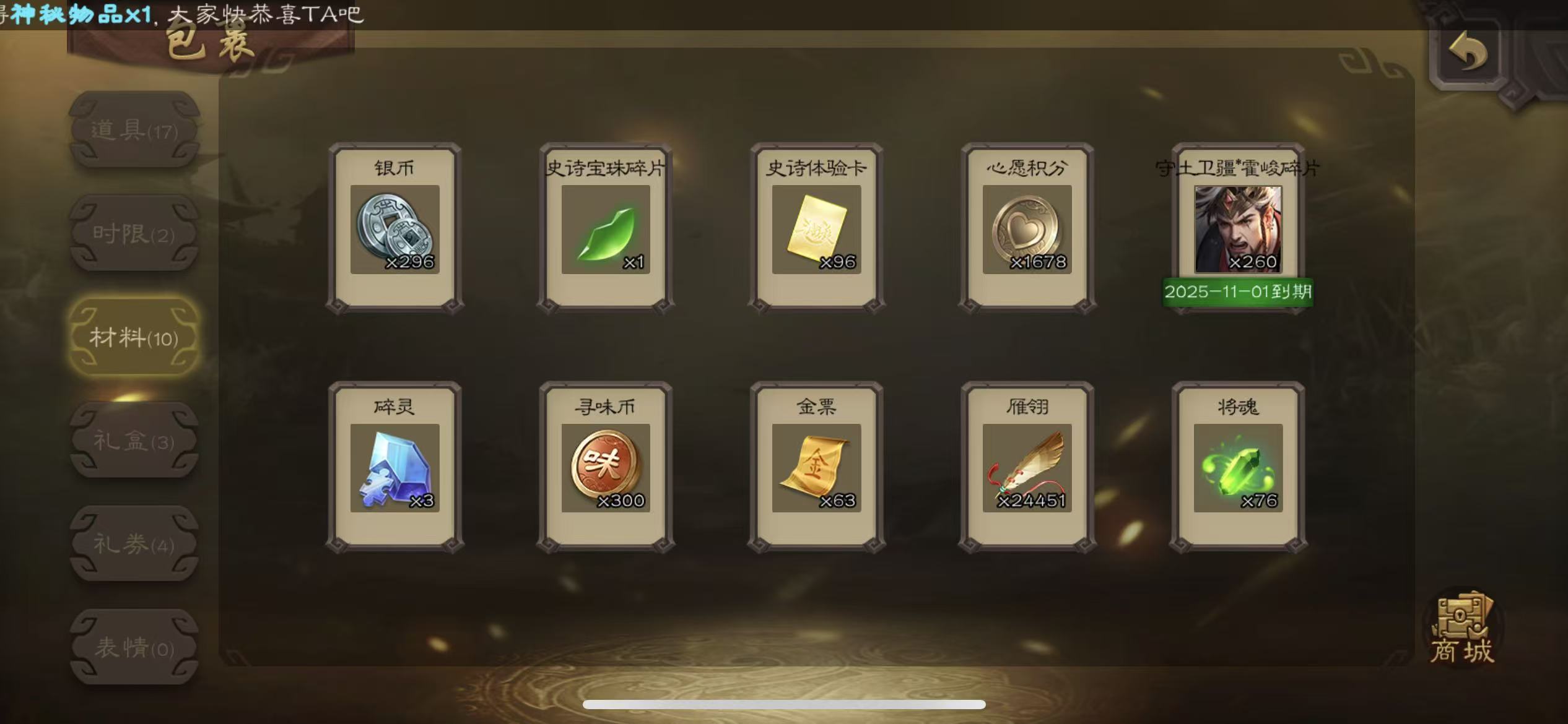百夫长谋关羽20宝珠(可换大宝)戏子2900将魂4万羽毛三卡