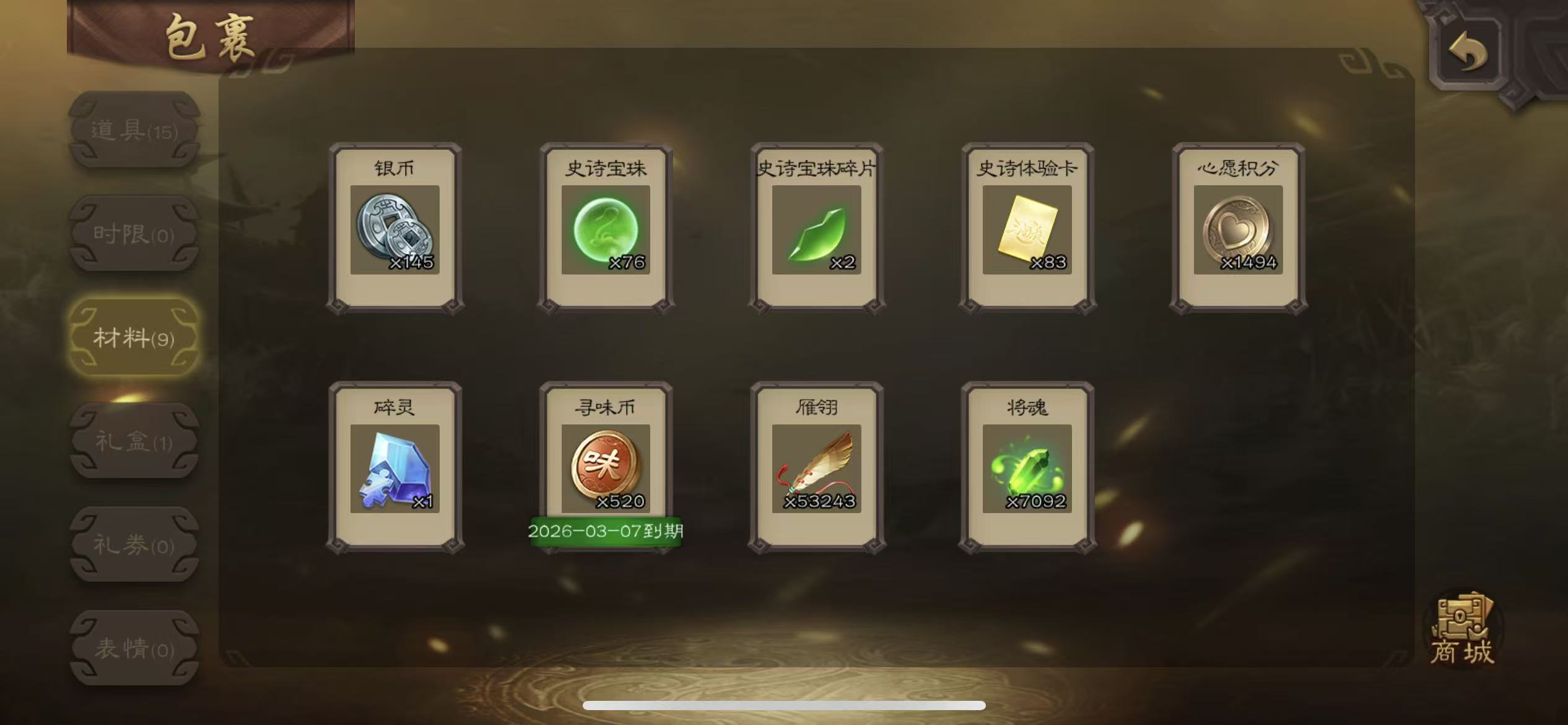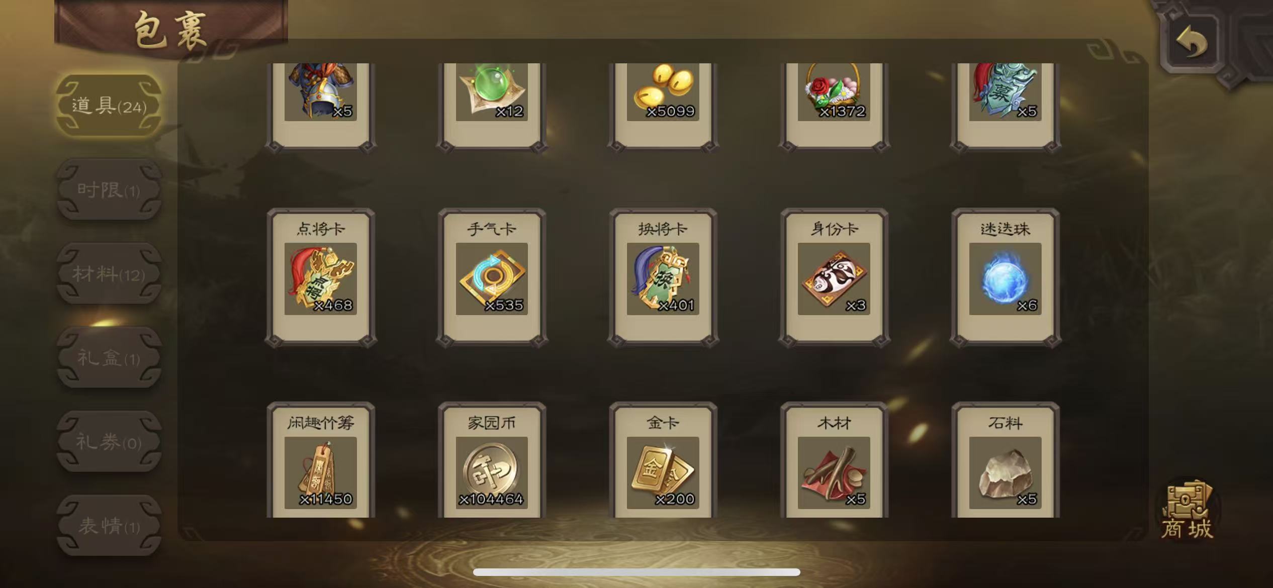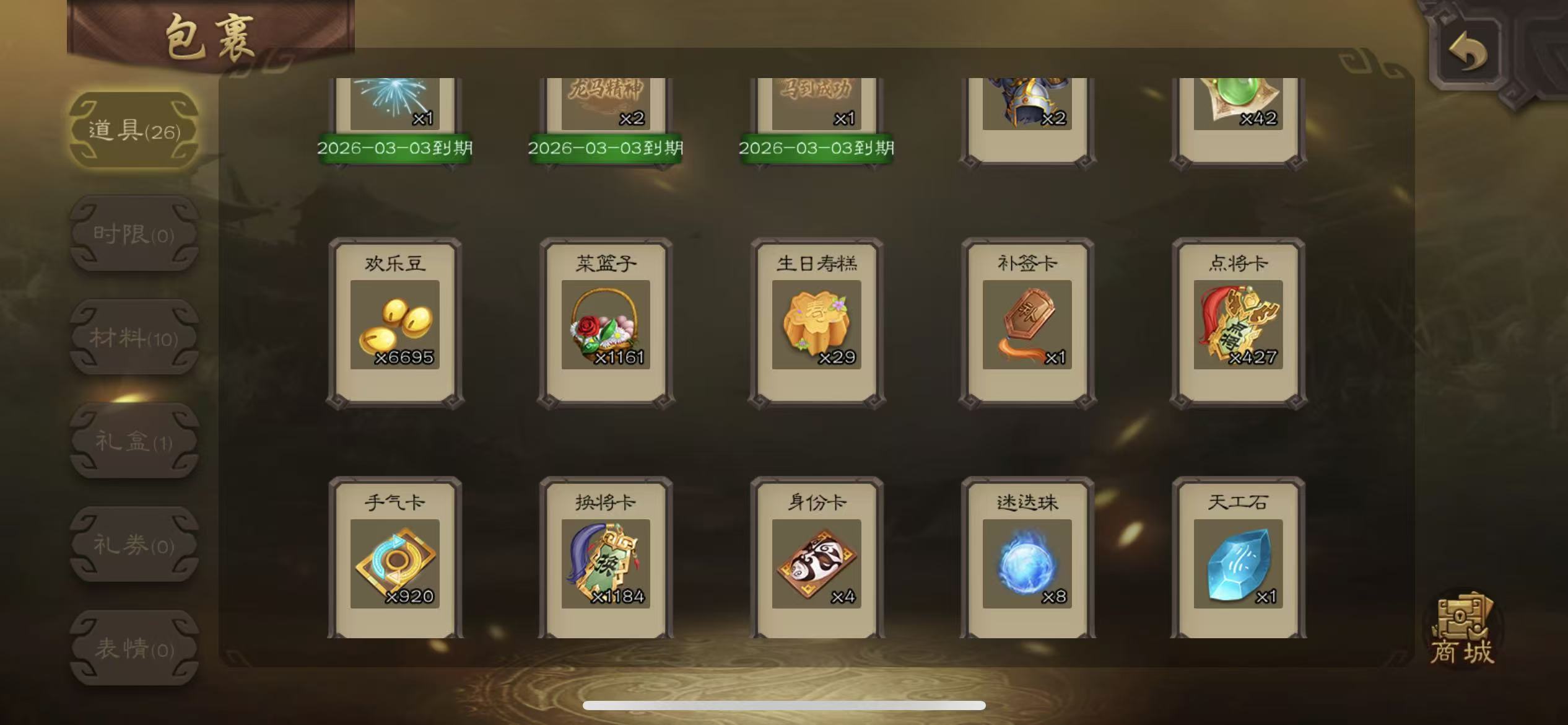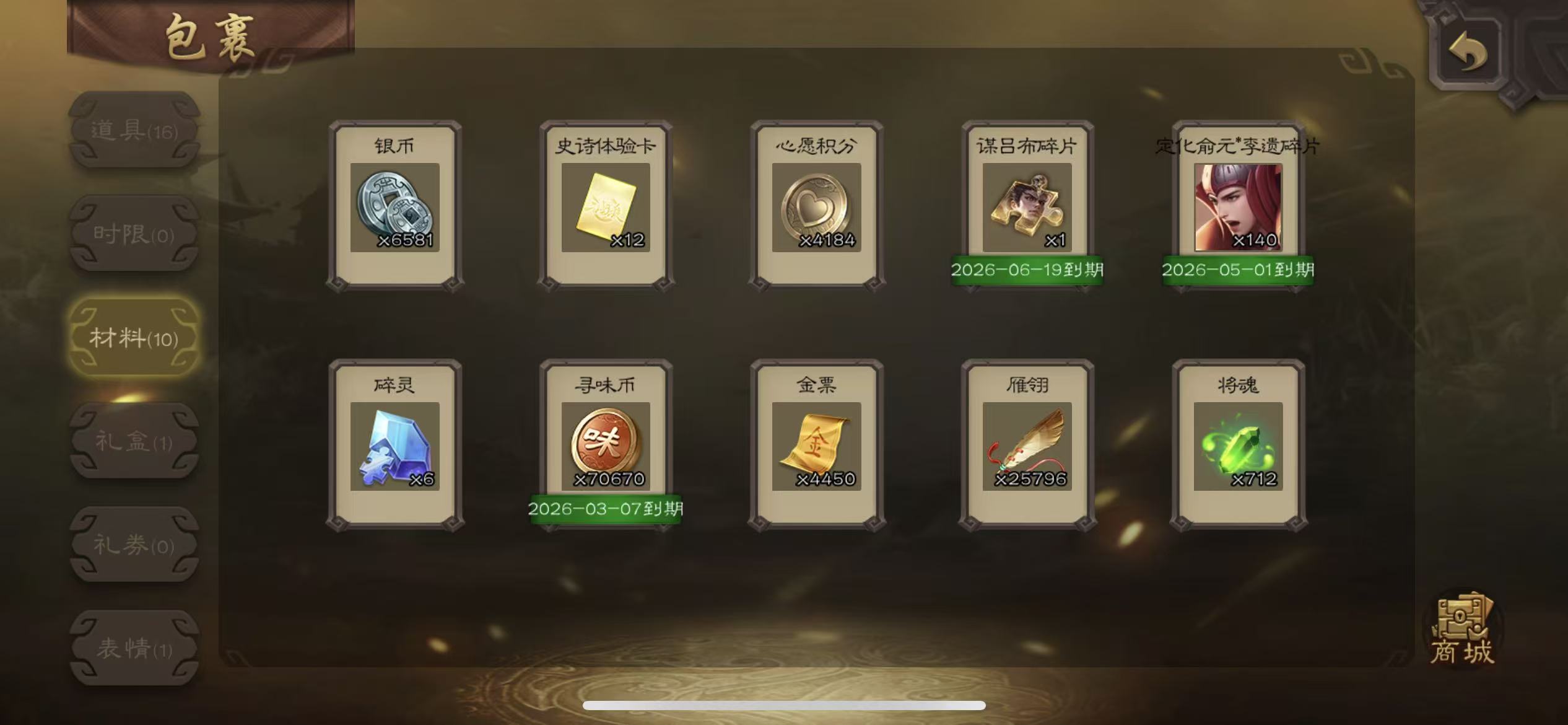 士兵谋关羽20宝珠(可换大宝)7000将魂8万羽毛122招募令三卡