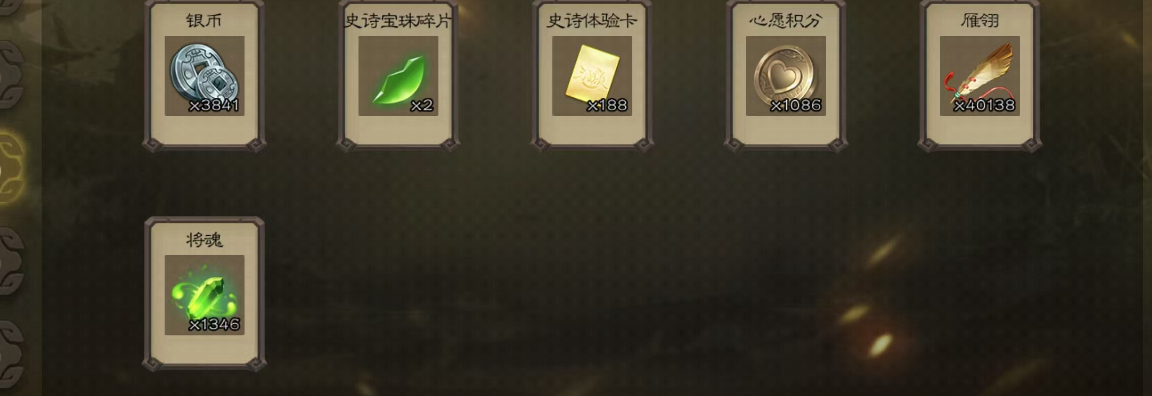士兵神郭嘉56宝珠(可换小鸟)7.26万羽毛8000将魂203雁翎甲138招募令三卡4500菜篮子