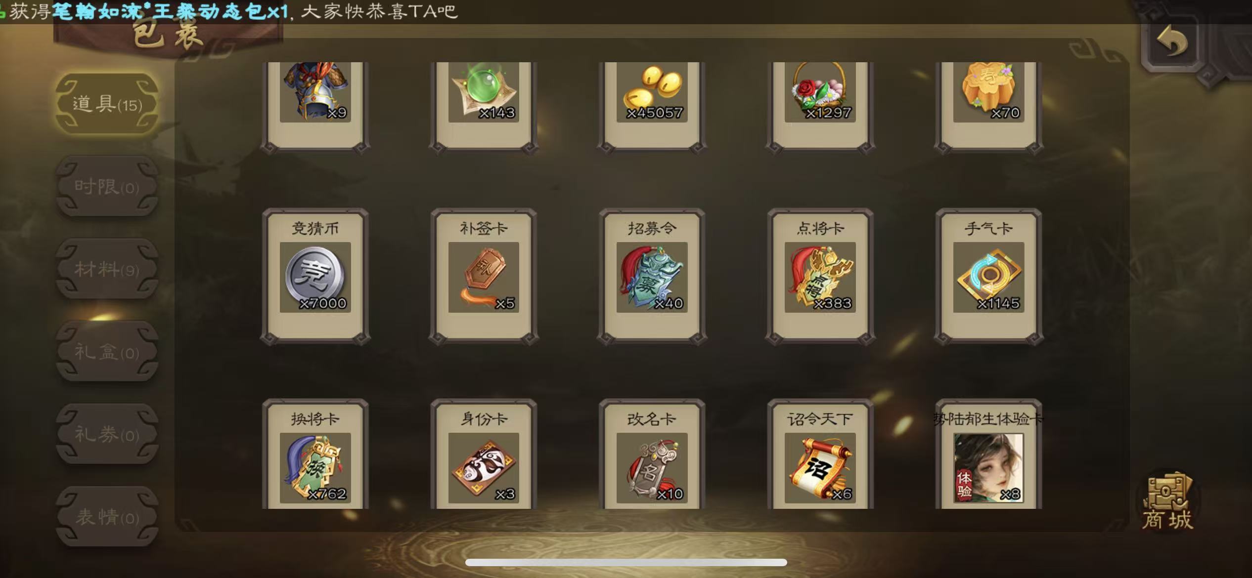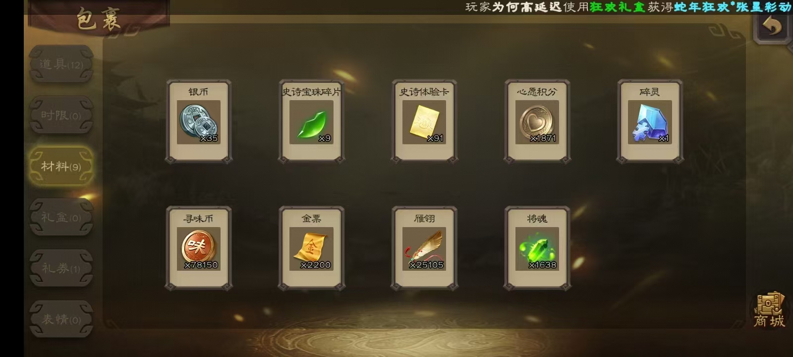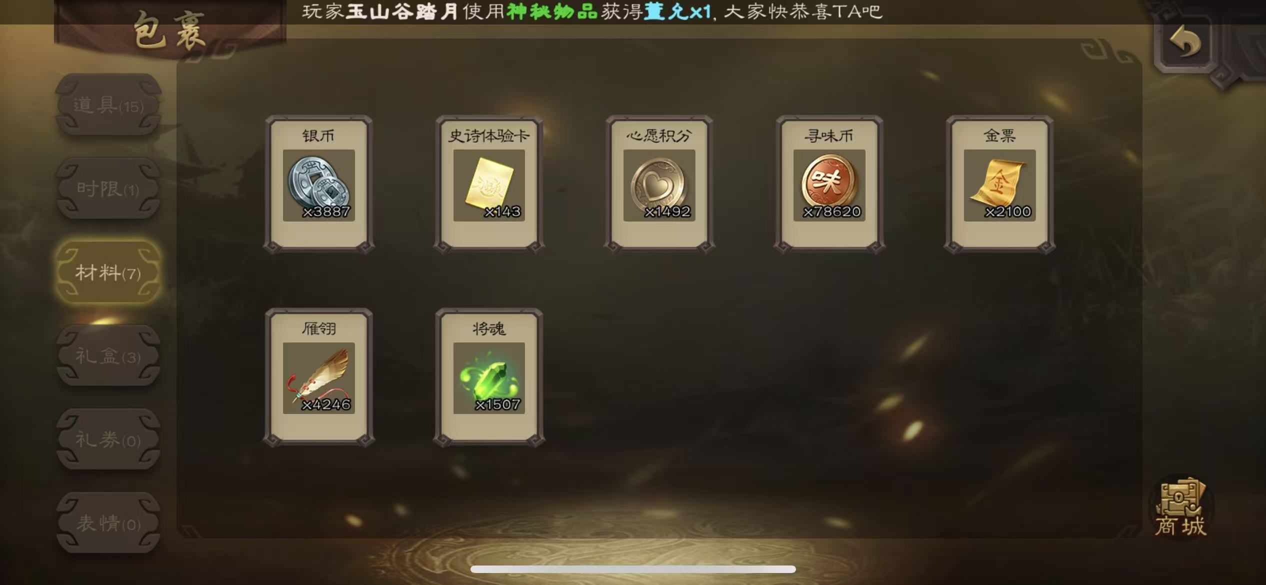 士兵势太史慈6300将魂(可换白马)3.6万羽毛4.8万银币4.5万豆三卡1200篮子