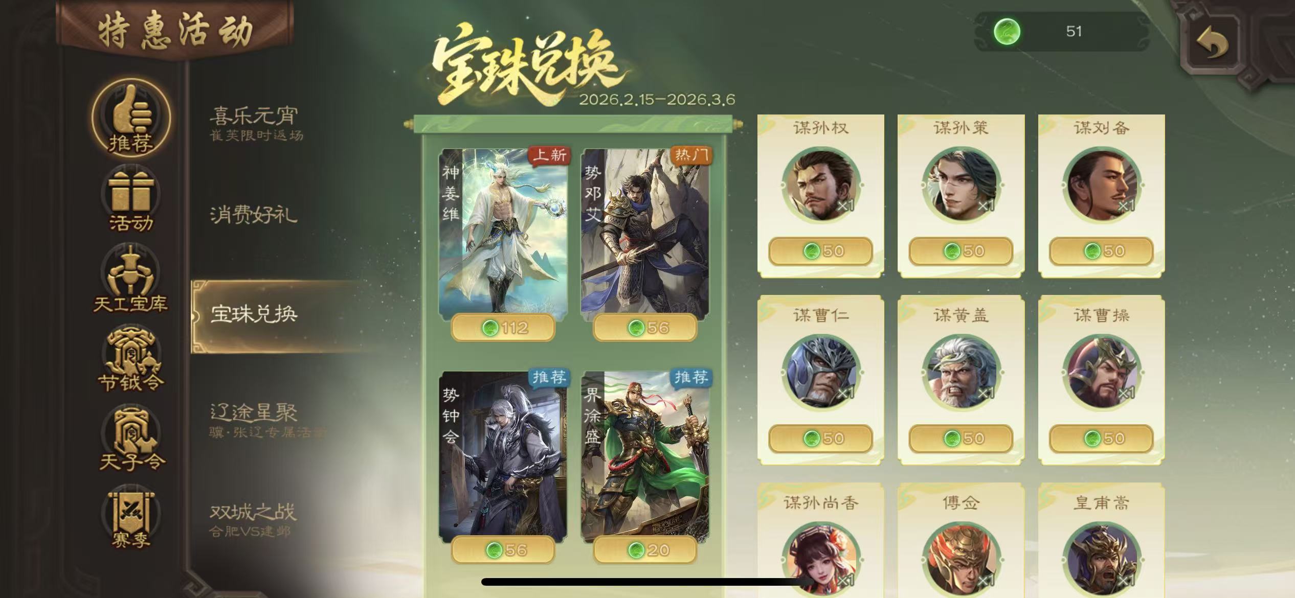 千夫长势钟会大宝神赵云4800将魂4万羽毛131招募令三卡