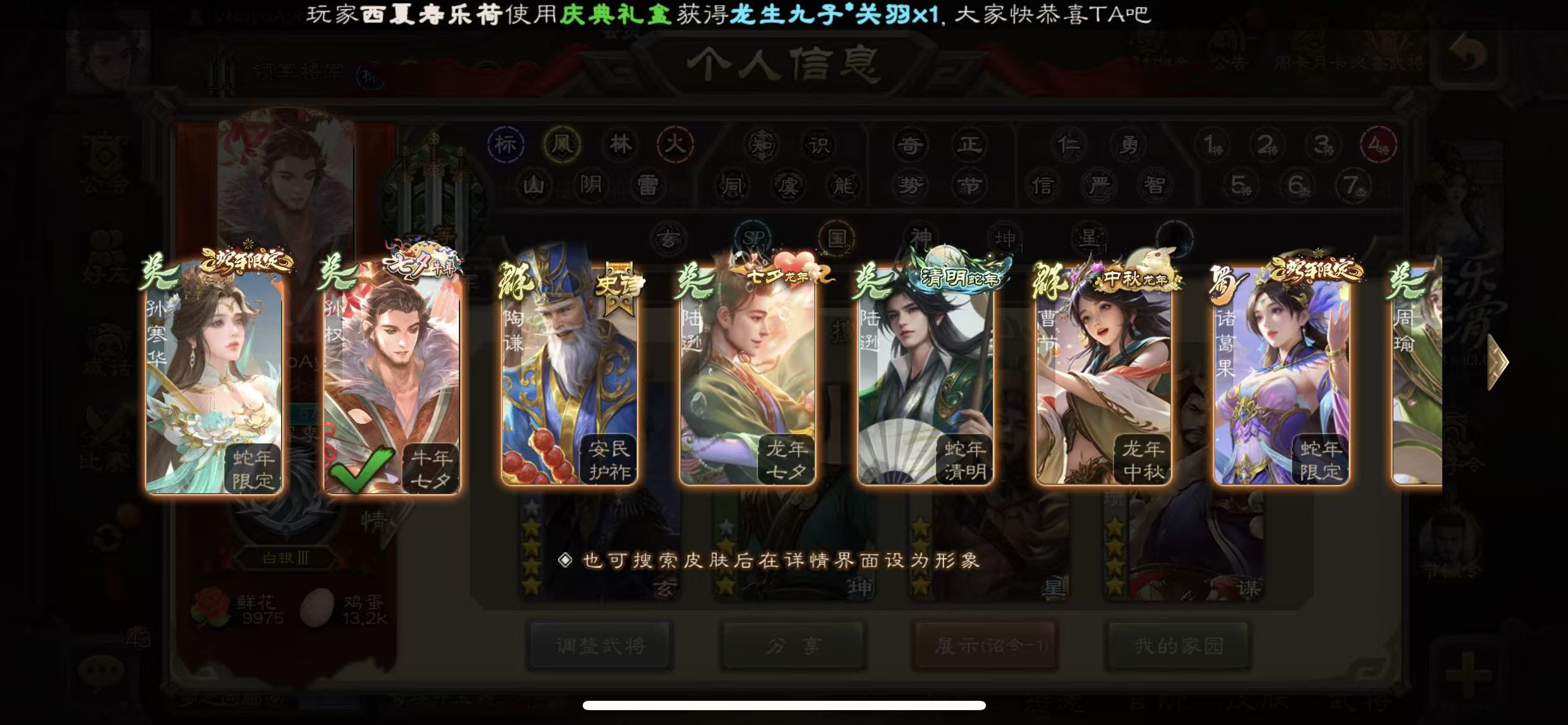 先锋谋诸葛亮51宝珠(可换小鸟势幸宪英势国渊势陆郁生司马昭等其一)9万羽毛1.3万将魂三卡