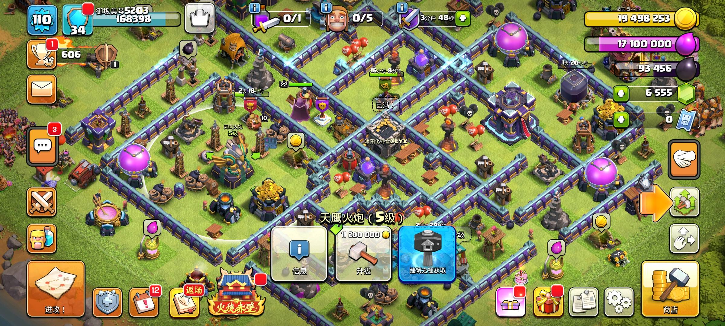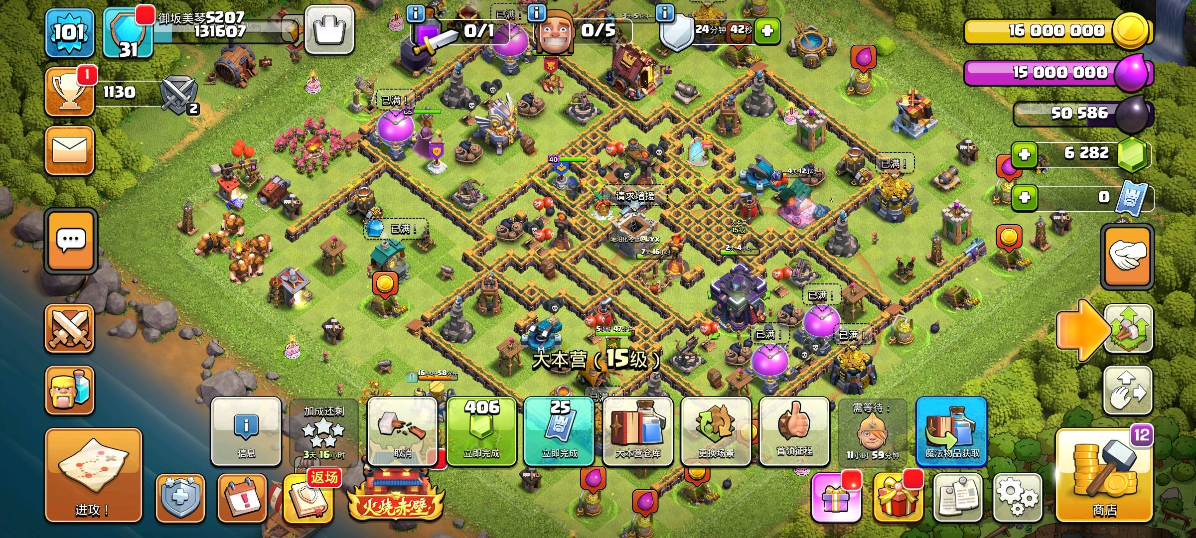 [代售]【部落冲突15本优质账号“御坂美琴5203”出售】 15级大本营潜力十足!蛮王45、女王40、飞盾战神39、咏王22、战神12,战宠助力战力进阶;魔法物品库存丰富,各类资源药水、升级道具加速发育。 英雄皮肤阵容亮眼:火蛇战神、魔法蛮王、爆裂小队蛮王、夏日女皇、角斗士女皇等稀有外观